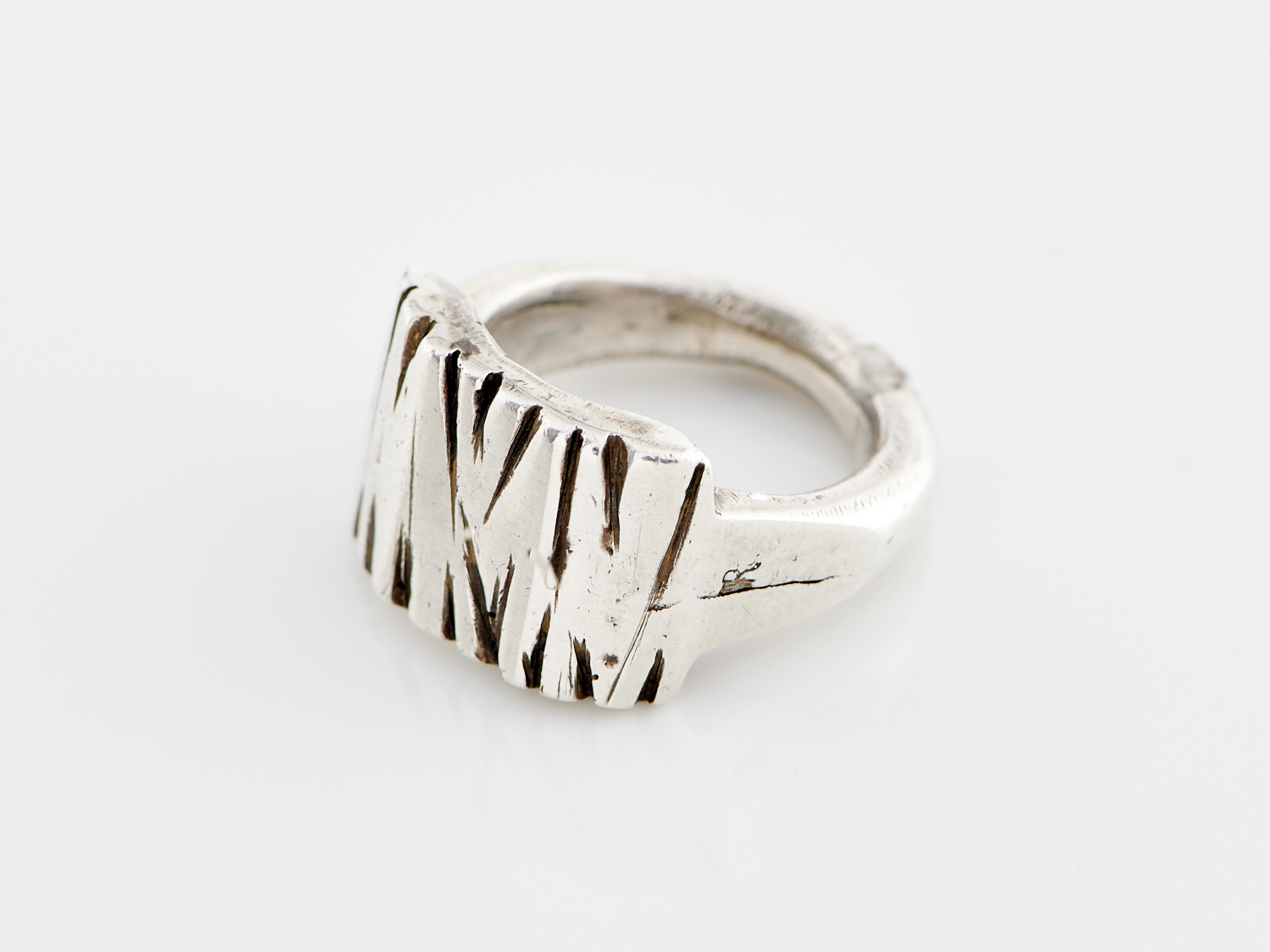 A HAND MADE RING BY MIRO IN STERLING SILVER, RING SIZE T