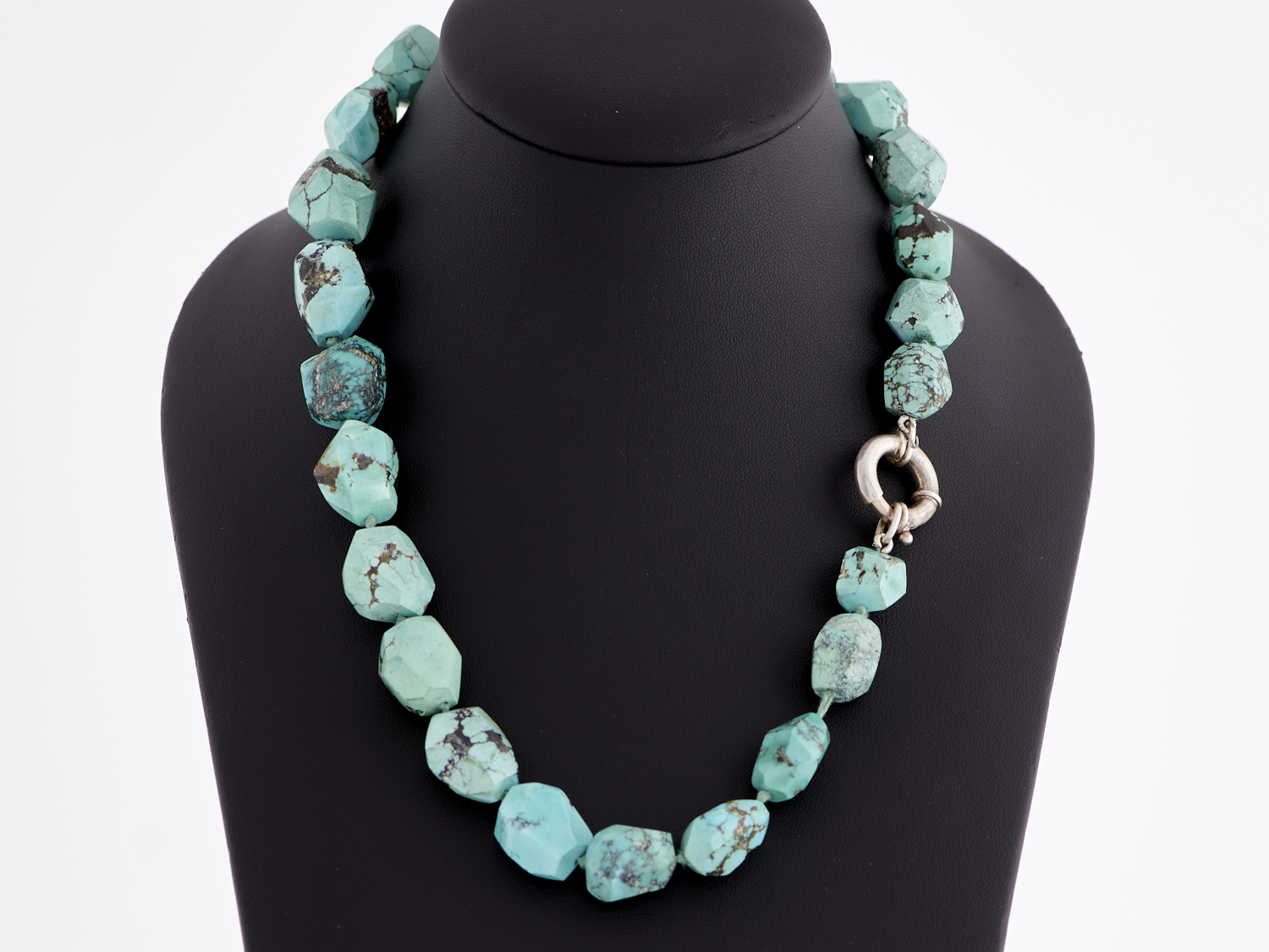 A FACETED TURQUOISE BEADED NECKLACE TO A BOLT CLASP IN STERLING SILVER, LENGTH 460MM