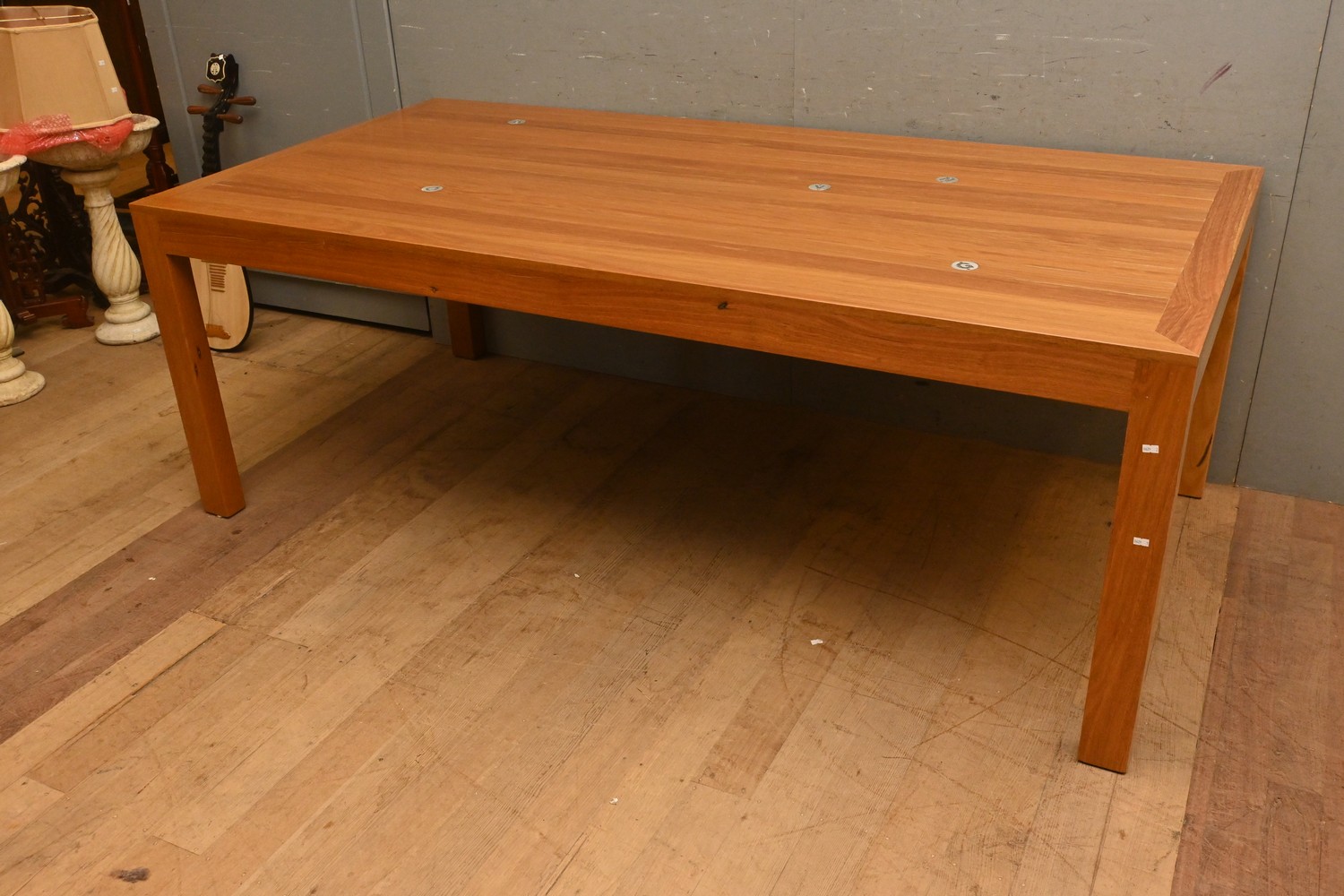 A CONTEMPORARY TALLOWOOD DINING TABLE ( 76H X 210W X 106D CM) (PLEASE NOTE THIS HEAVY ITEM MUST BE REMOVED BY CARRIERS AT THE CUSTOMER'S EXPENSE. LEONARD JOEL STAFF CANNOT ASSIST CARRYING THIS ITEM) (X-LARGE ITEM)