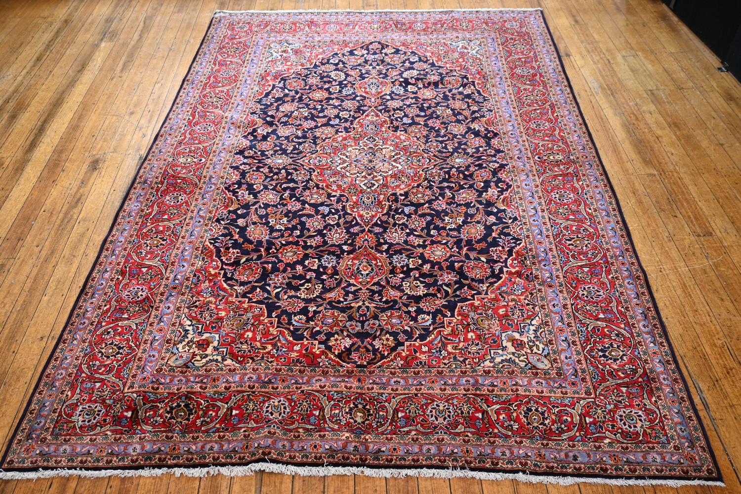 A VERY FINE PERSIAN KASHAN RUG WITH SOLID DENSE PILE ON A RED & BLUE FIELD (A/F) ( 371X 252 CM) (PLEASE NOTE THIS HEAVY ITEM MUST BE REMOVED BY CARRIERS AT THE CUSTOMER'S EXPENSE. LEONARD JOEL STAFF CANNOT ASSIST CARRYING THIS ITEM) (X-LARGE ITEM)