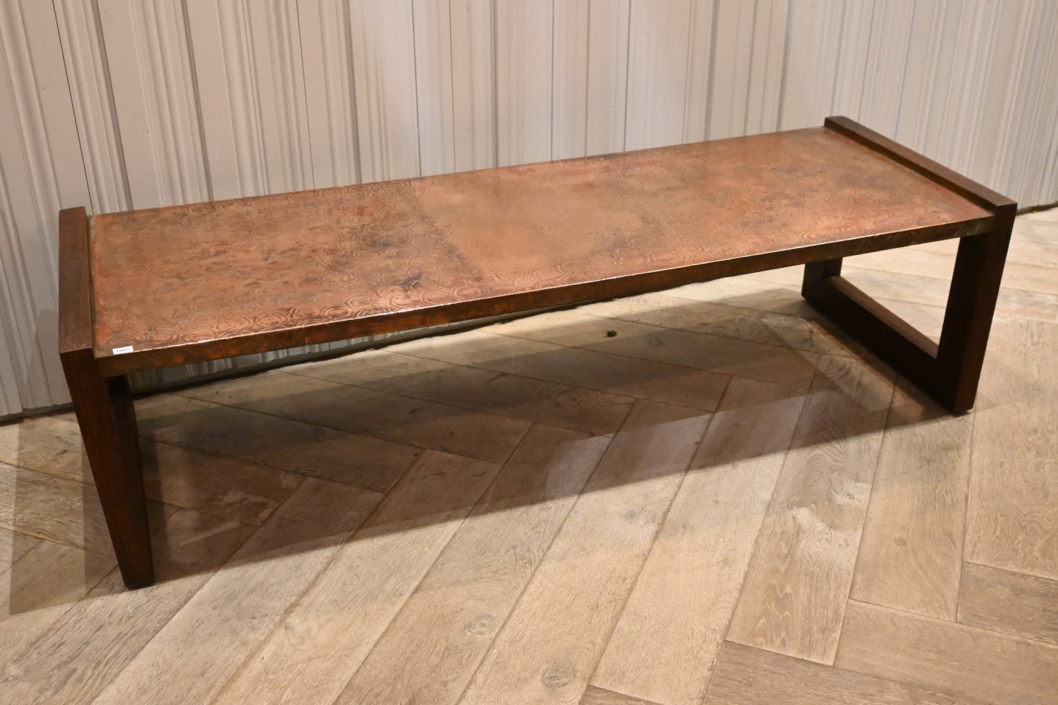 A MID CENTURY CENTURY COPPER AND TIMBER COFFEE TABLE FOR BERZCI A/F (42H X 154W X 53D) (LEONARD JOEL DELIVERY SIZE: LARGE)