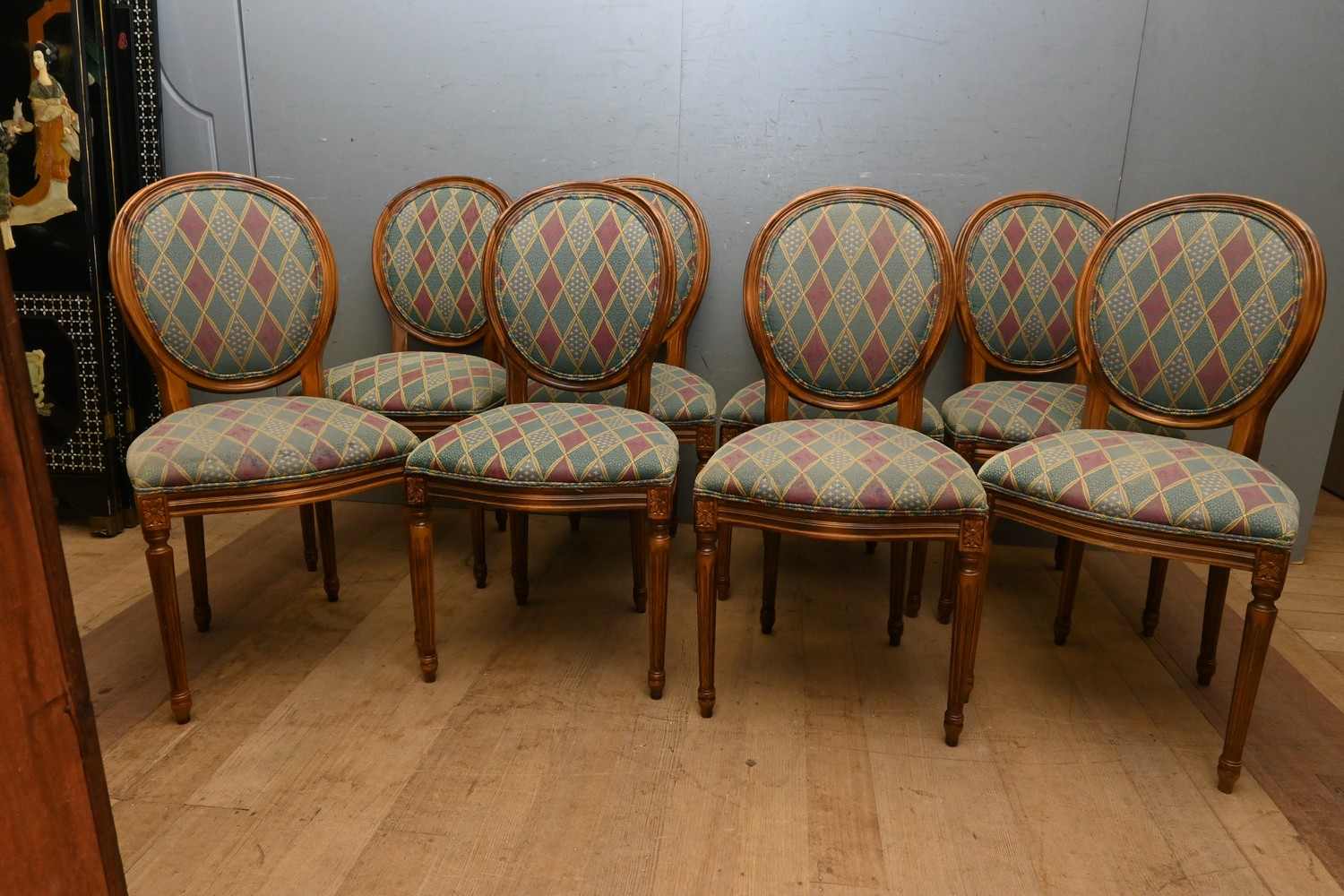 A SET OF EIGHT FRENCH STYLE DINING CHAIRS (A/F) (96H X 48W X 55D CM) (LEONARD JOEL DELIVERY SIZE: X-LARGE)