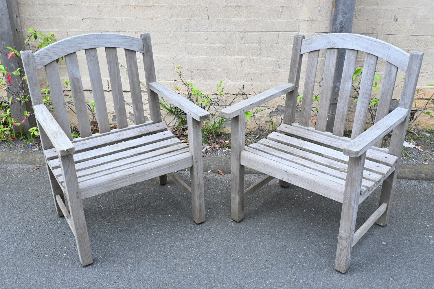 A PAIR OF JATI TEAK OUTDOOR ARMCHAIRS (92H X 64W X 60D CM) (LEONARD JOEL DELIVERY SIZE: X-LARGE)