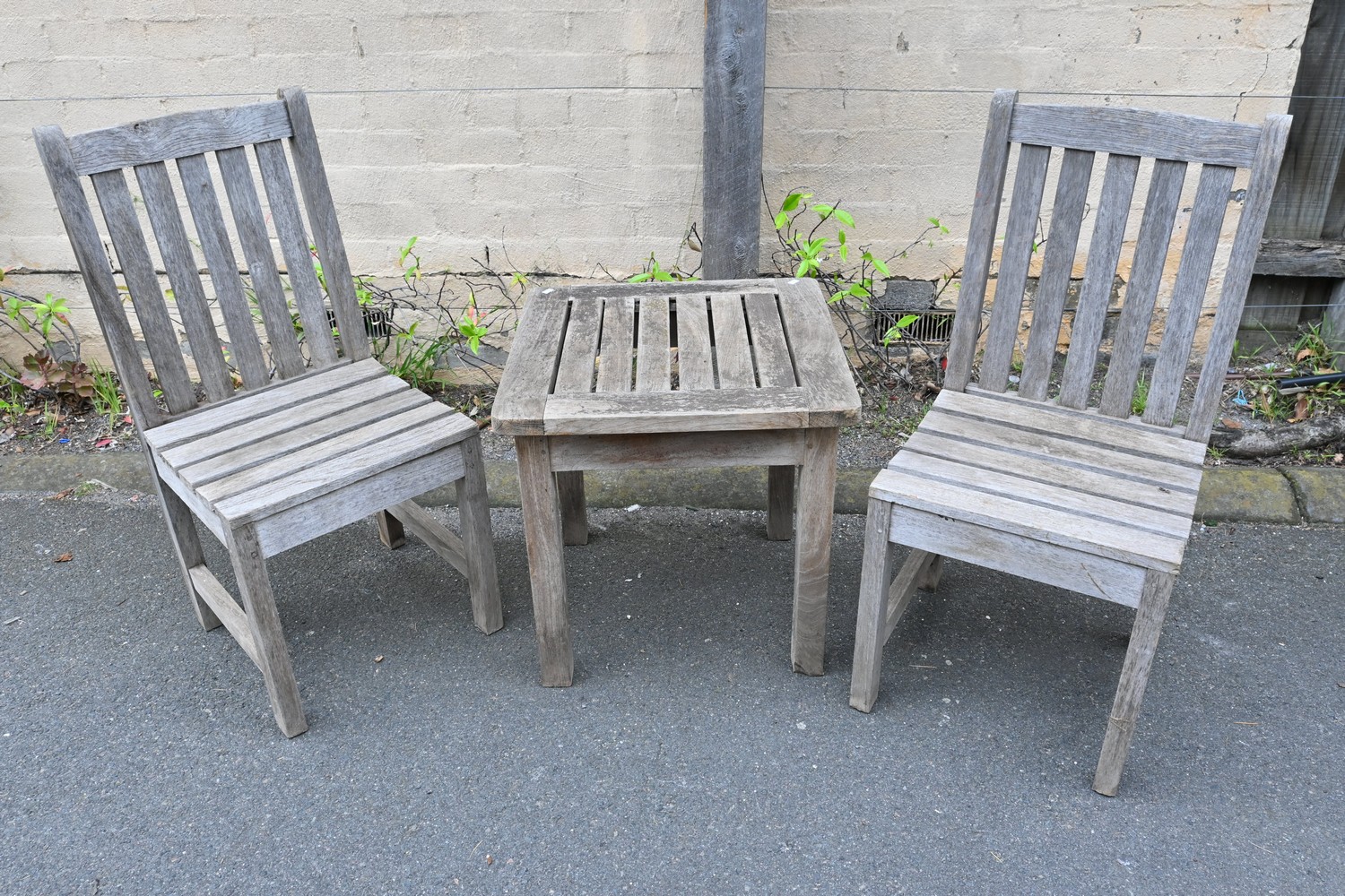 A TEAK THREE PIECE OUTDOOR SETTING TABLE (A/F) (954H X 54W X 54D CM) (LEONARD JOEL DELIVERY SIZE: X-LARGE)