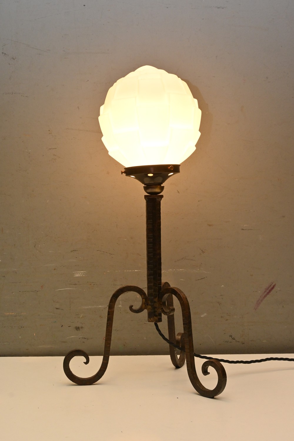 A FRENCH ART DECO BLACK IRON LAMP WITH WITH GLASS SHADE (63H X 33D CM) (LEONARD JOEL DELIVERY SIZE: MEDIUM)