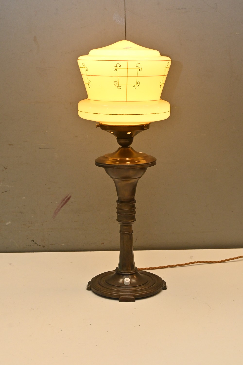 AN AMERICAN ART DECO CAST METAL LAMP WITH DEOCARTIVE CREAM GLASS SHADE ( 57H X 24 DIAMETER CM) (LEONARD JOEL DELIVERY SIZE: LARGE)