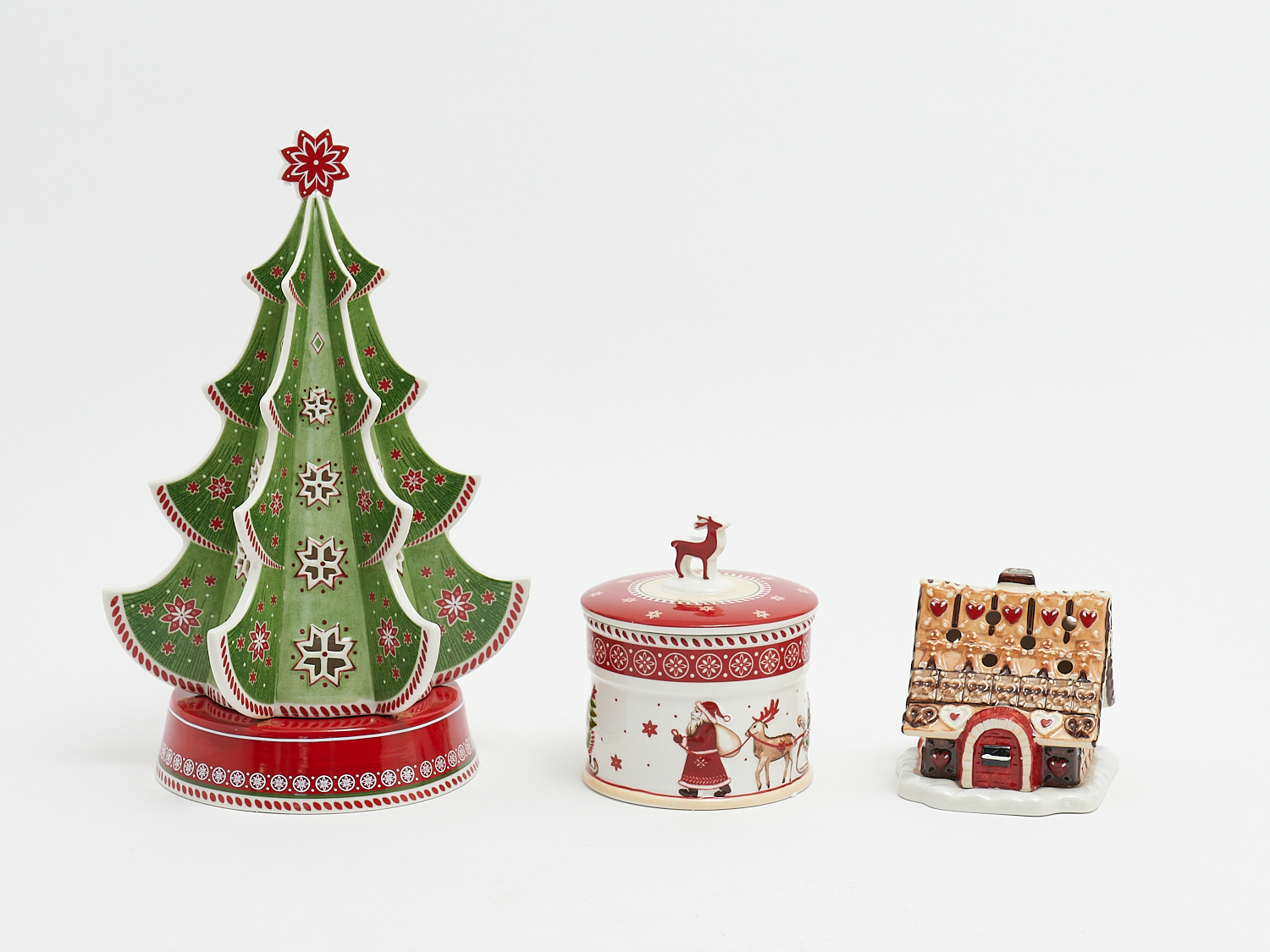 A GROUP OF THREE VILLEROY AND BOCH CHRISTMAS CERAMICS INCLUDING CHRISTMAS TREE, GINGERBREAD HOUSE AND LIDDED BOX, LEONARD JOEL LOCAL DELIVERY: MEDIUM