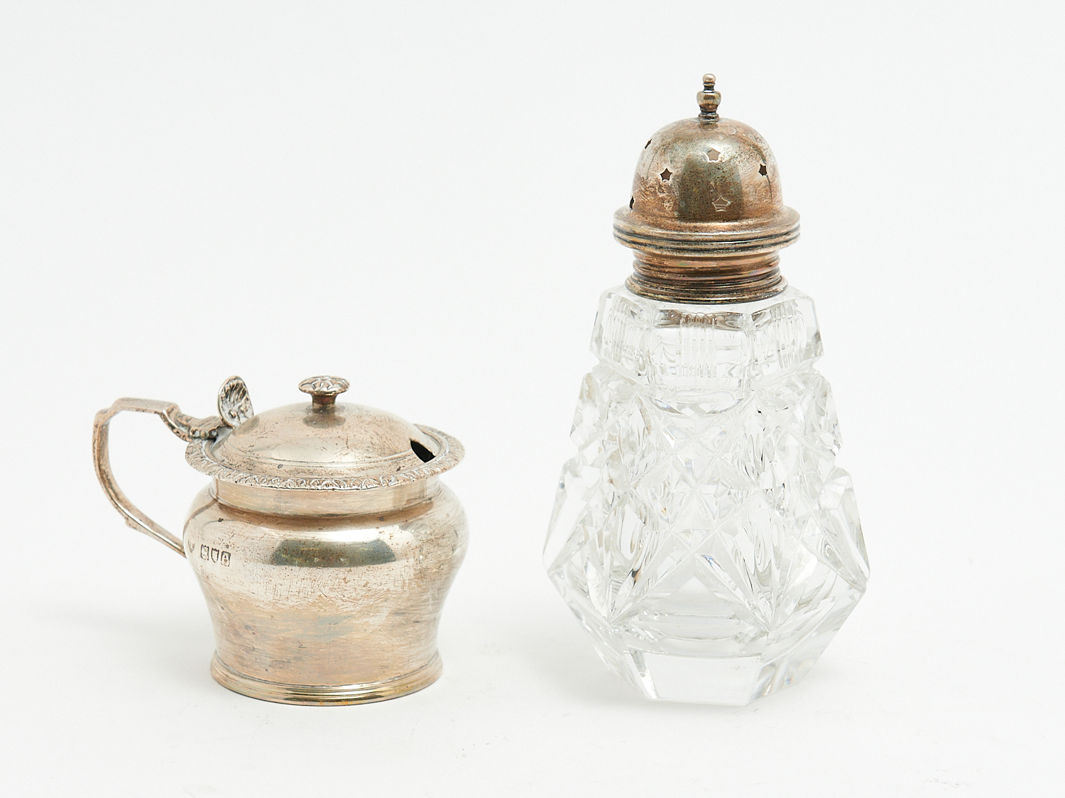 A STERLING SILVER TOPPED CASTOR TOGETHER WITH STERLING SILVER MUSTARD POT H.14.5CM (TALLEST), LEONARD JOEL LOCAL DELIVERY: SMALL