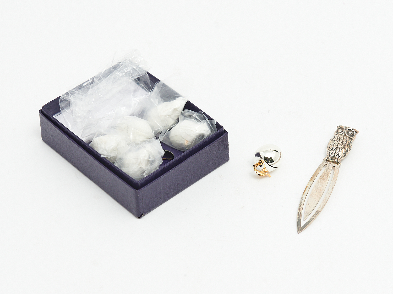 A 925 SILVER OWL BOOKMARK TOGETHER WITH APPLE PLACE CARD HOLDERS, LEONARD JOEL LOCAL DELIVERY: SMALL