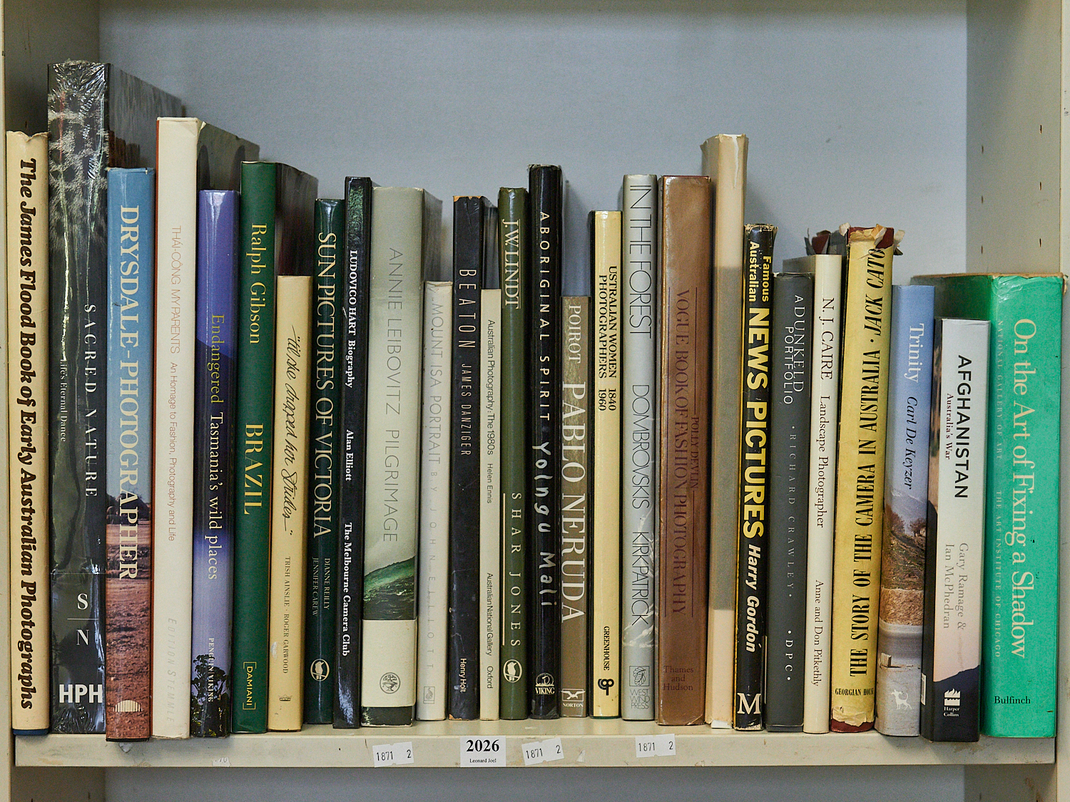 SHELF OF PHOTOGRAPHY INCLUDING JONATHAN AND ANGELA SCOTT 'SACRED NATURE' (FIRST EDITION, SEALED COPY), PETER DOMBROVSKIS 'IN THE FOREST', 'THE JAMES FLOOD BOOK OF EARLY AUSTRALIAN PHOTOGRAPHY', ANNIE LEBOVITZ 'PILGRIMAGE' ETC, LEONARD JOEL LOCAL DELIVERY: MEDIUM