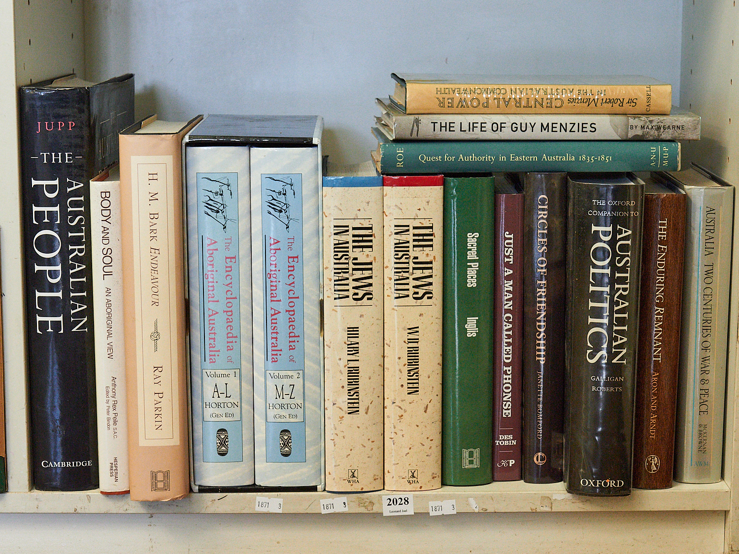 SHELF OF AUSTRALIAN HISTORICAL REFERENCE INCLUDING RUBINSTEIN 'THE JEWS IN AUSTRALIA' (TWO VOLUMES SIGNED), RAY PARKIN 'H.M. BARK ENDEAVOUR', HORTON 'ENCYCLOPEDIA OF ABORIGINAL AUSTRALIA 9TWO VOLUMES SLIPCASED), JAMES JUPP (ED.) 'THE AUSTRALIAN PEOPLE', K.S. INGLIS 'SACRED PLACES', LEONARD JOEL LOCAL DELIVERY: MEDIUM