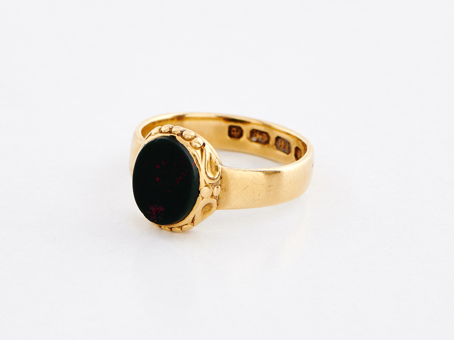AN ANTIQUE BLOODSTONE RING IN 18CT GOLD, BIRMINGHAM HALLAMRKS, CIRCA 1865, RING SIZE S, WEIGHT 6GMS