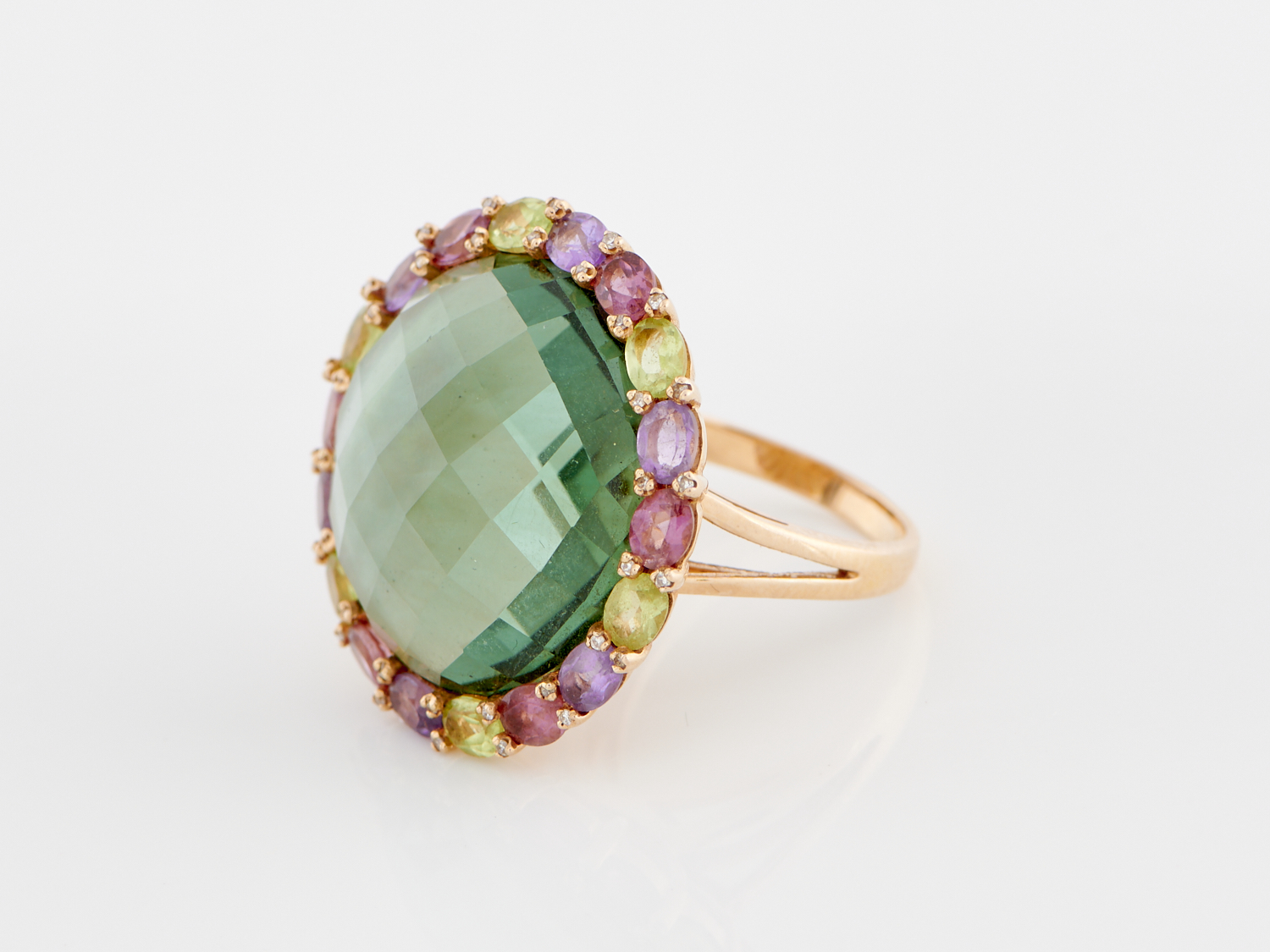A GEM-SET COCKTAIL RING IN 18CT GOLD, SIZE O, 13.4GMS