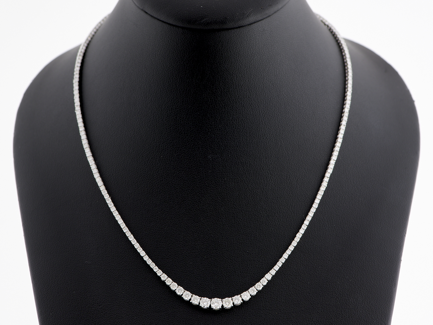 A DIAMOND RIVIERE NECKLACE IN 18CT WHITE GOLD, THE DIAMONDS TOTALLING 7.25CTS, COLOUR F-G, CLARITY VS-P1, LENGTH 440MM, ACCOMPANIED BY VALUATION