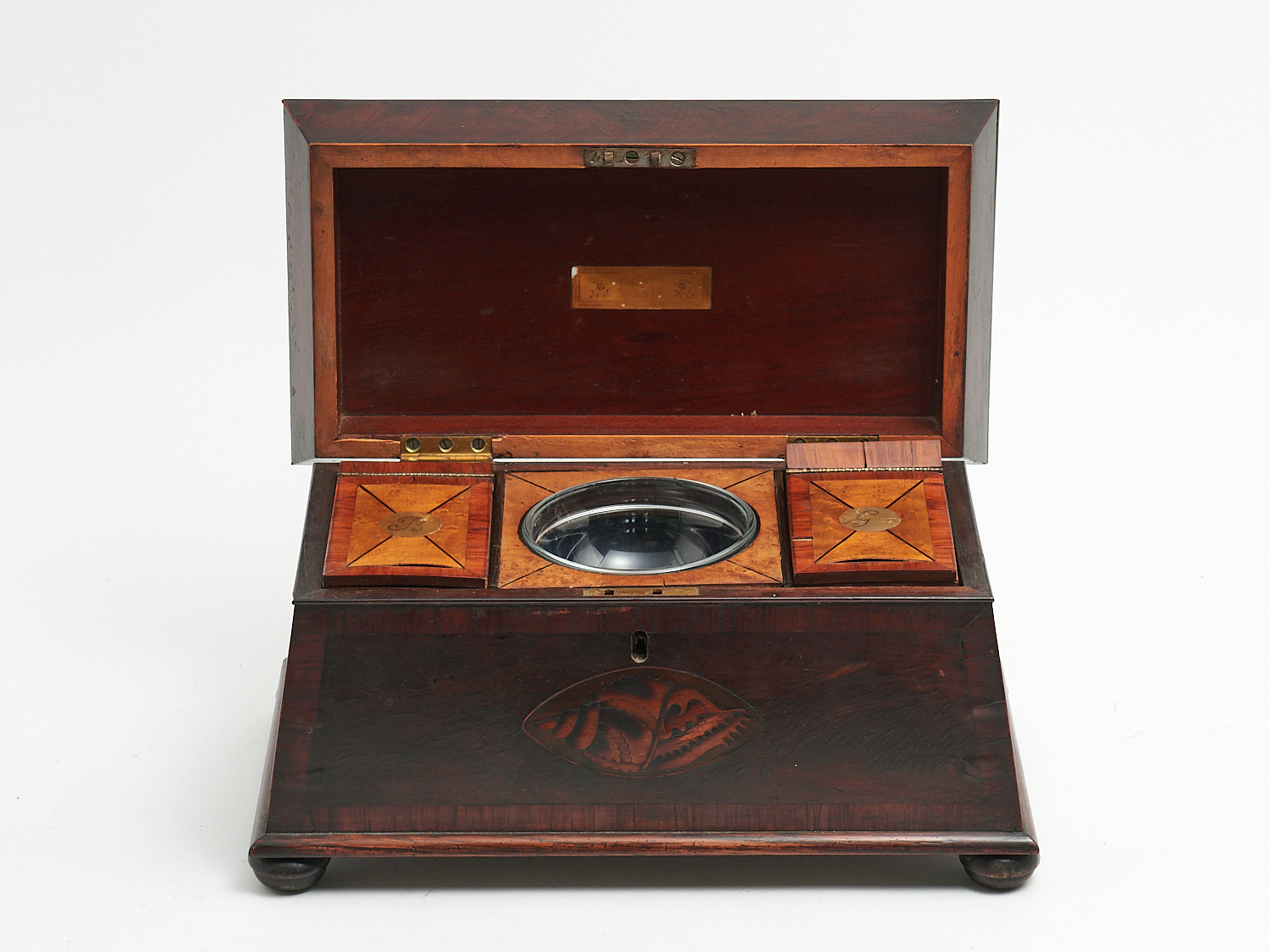 A CEDAR SARCOPHAGUS FORM TEA CADDY WITH SHELL MARQUETRY INLAY C.1850 FITTED WITH MIXING BOWL AND LIDDED COMPARTMENTS (A/F) H.20.5CM X W.33CM X D.18CM, LEONARD JOEL LOCAL DELIVERY: MEDIUM