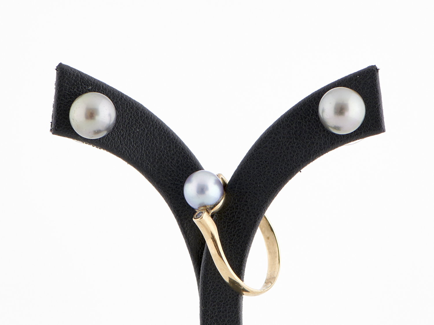 A TAHITIAN PEARL JEWELLERY SUITE, INCLUDING 8.19MM EARRINGS TO POST FITTINGS IN 18CT GOLD AND 6.90MM PEARL SET RING IN 9CT GOLD (2.3GMS), RING SIZE M