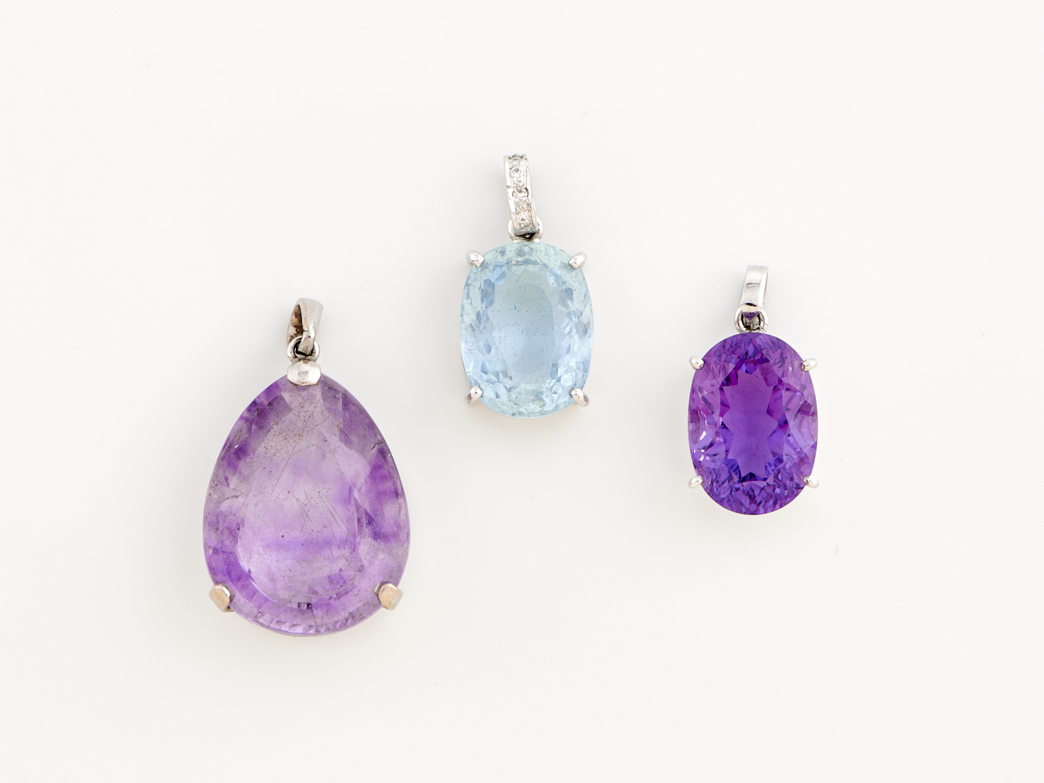 A COLLECTION OF THREE PENDANTS INCLUDING AMETHYST AND TOPAZ SET IN 14CT WHITE GOLD