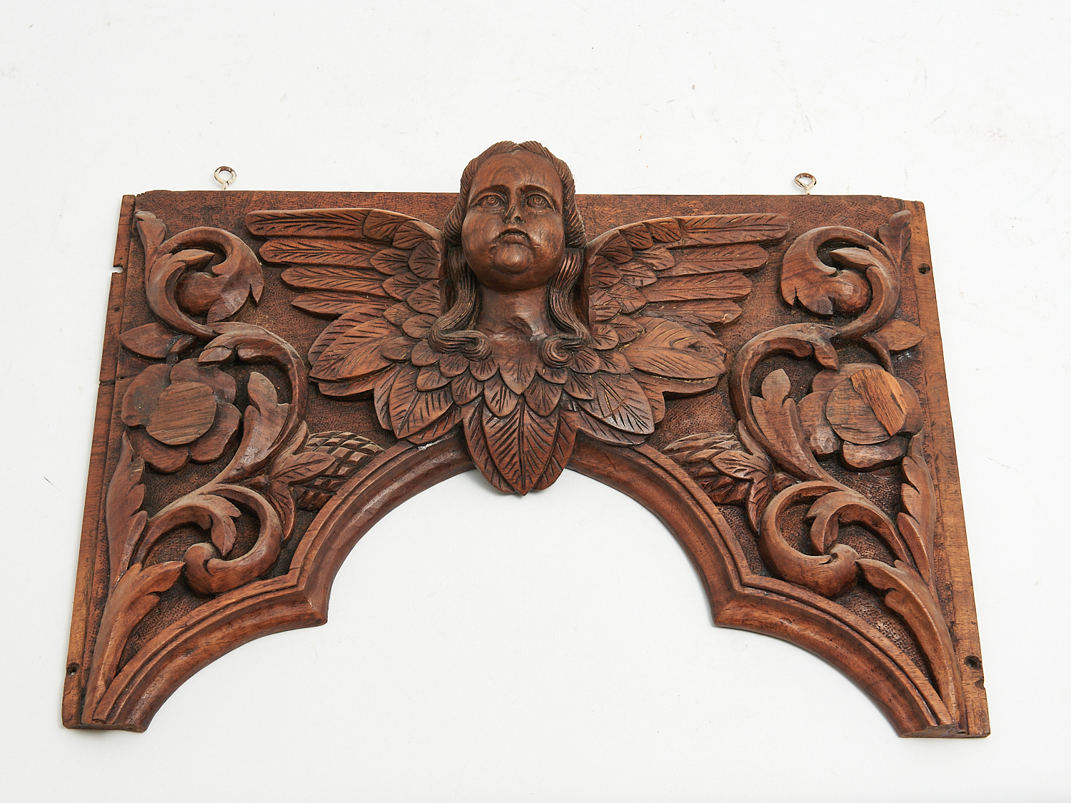 A CARVED WOOD LINTEL DECORATION WITH CHERUB H.35CM X W.50CM, LEONARD JOEL LOCAL DELIVERY: MEDIUM