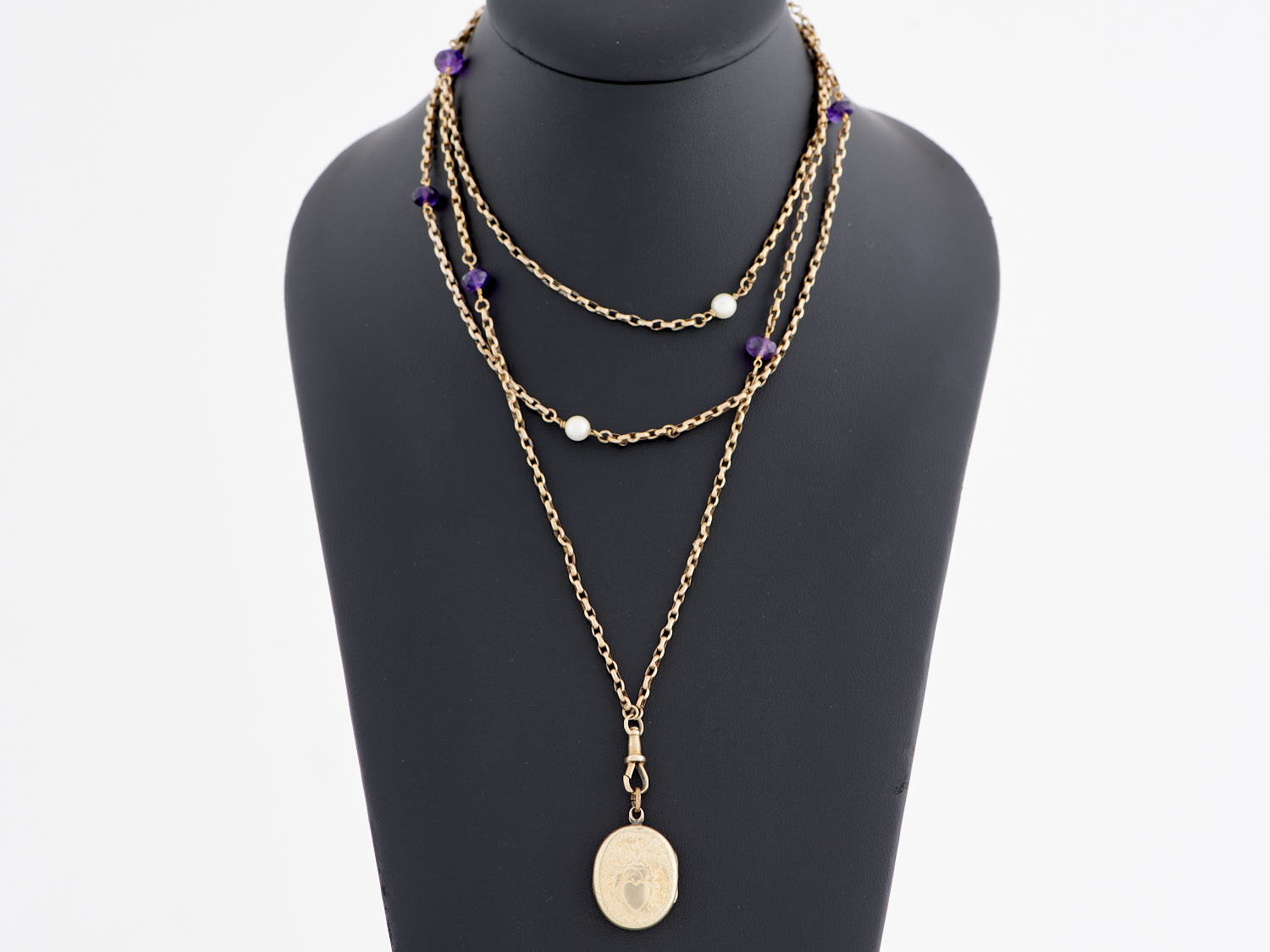 A VICTORIAN GUARD CHAIN WITH FACETTED AMETHYST BEADS AND PEARL DETAIL TO AN ENAMEL SET FRONT AND BACK LOCKET ALL IN 9CT GOLD, WEIGHT 18.4GMS, LENGTH 1160MM