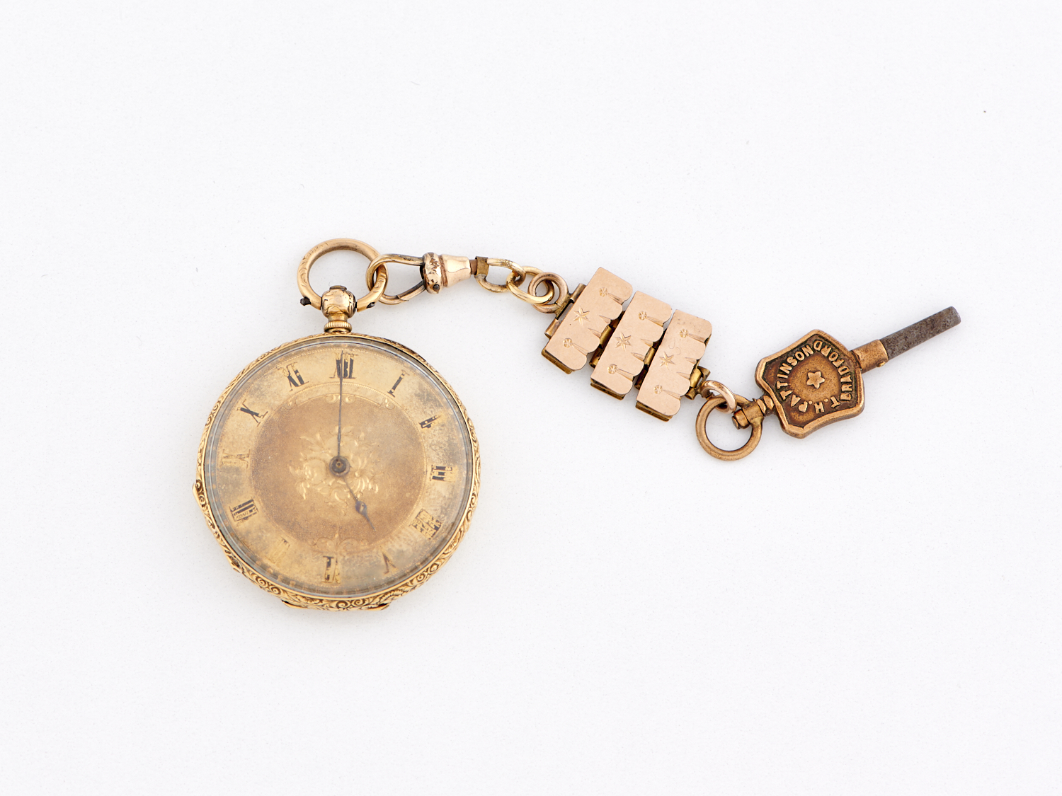 AN ANTIQUE KEY WIND POCKET WATCH IN 18CT GOLD, WEIGHT 31.1GMS, TO A FOB IN 9CT GOLD, WEIGHT 4.8GMS, WATCH FACE DIAMETER 36MM