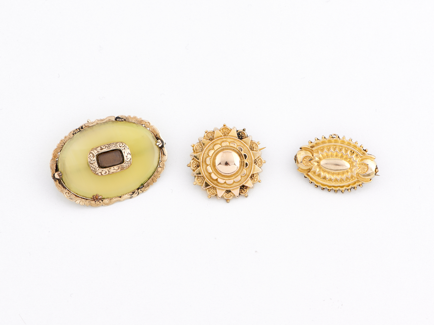 THREE VICTORIAN BROOCHES IN 9CT GOLD TO PINS IN BASE METAL, WEIGHT 26.2GMS