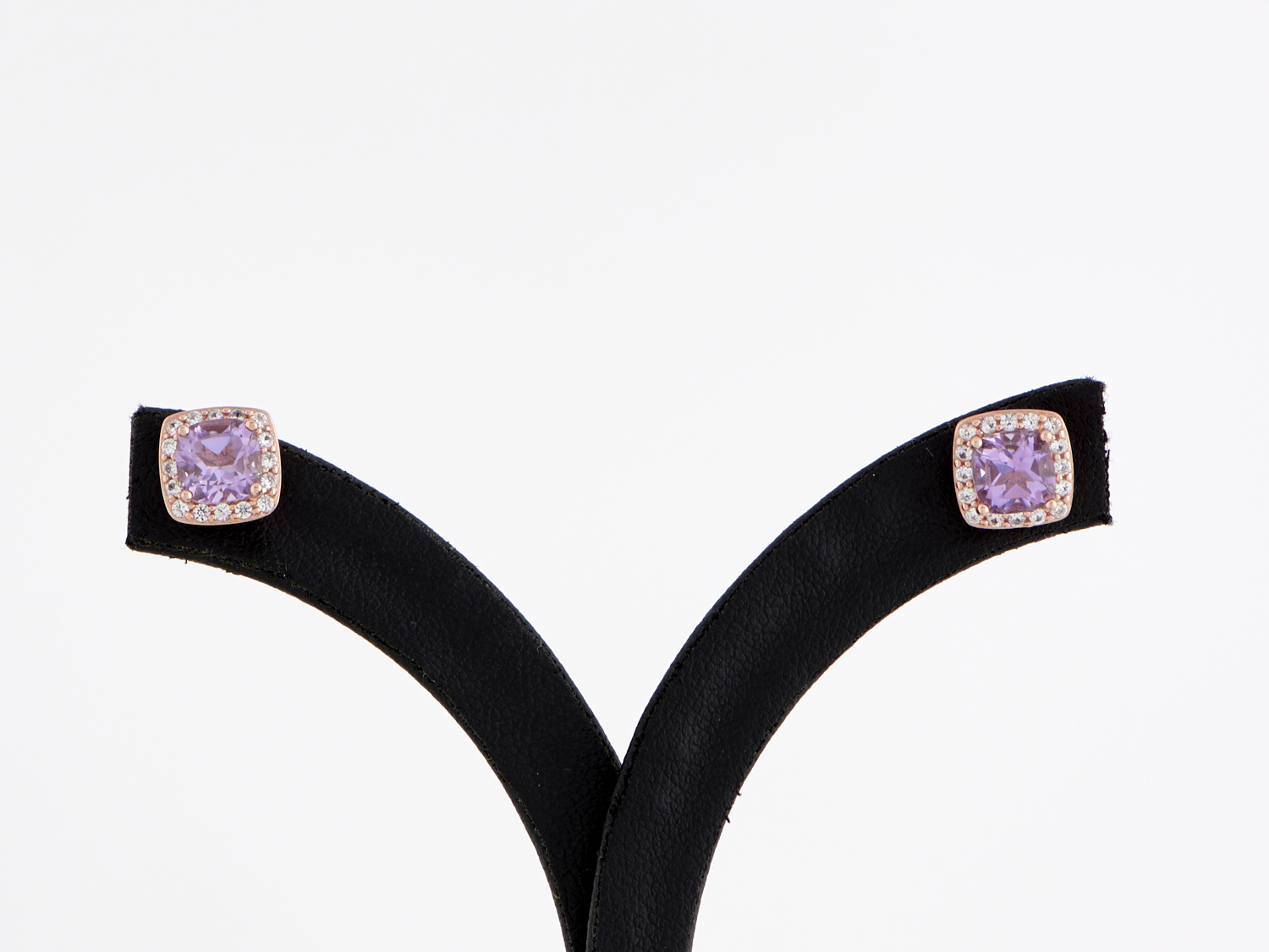 A PAIR OF AMETHYST AND WHITE SAPPHIRE STUDS, IN ROSE GOLD VERMEIL, TO POST AND BUTTERFLY FITTINGS, BOXED