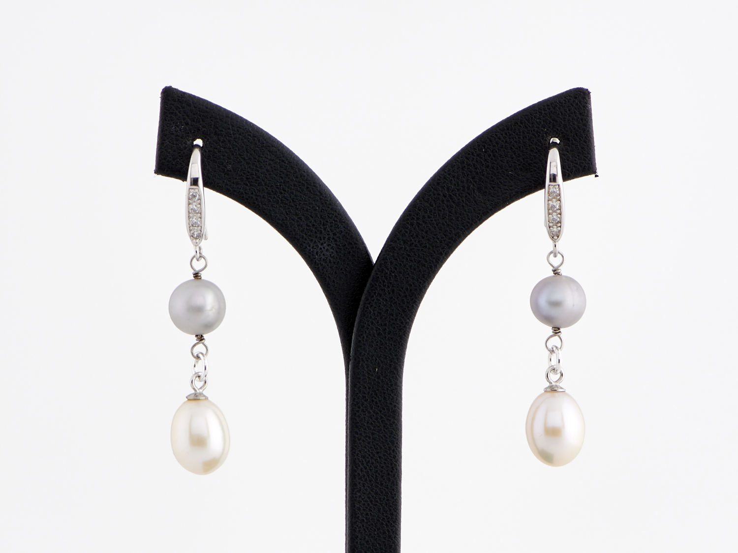 A PAIR OF GREY AND WHITE CULTURED PEARL DROP EARRINGS, TO SHEPHERDS HOOK FITTINGS IN SILVER