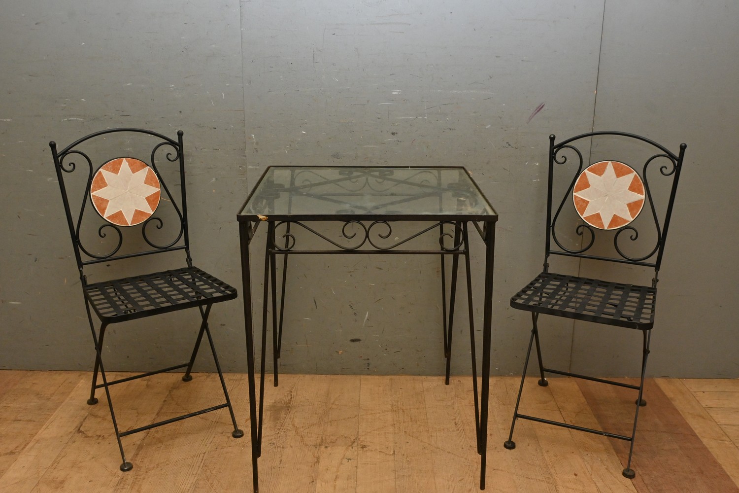AN AUSTRALIAN WROUGHT IRON GLASS TOPPED SQUARE FORM PATIO GARDEN TABLE WITH TWO LATER METAL AND TILE BACK TO FOLDING CHAIRS (A/F) 76H X 62W X 62W CM )(LEONARD JOEL DELIVERY SIZE: LARGE)