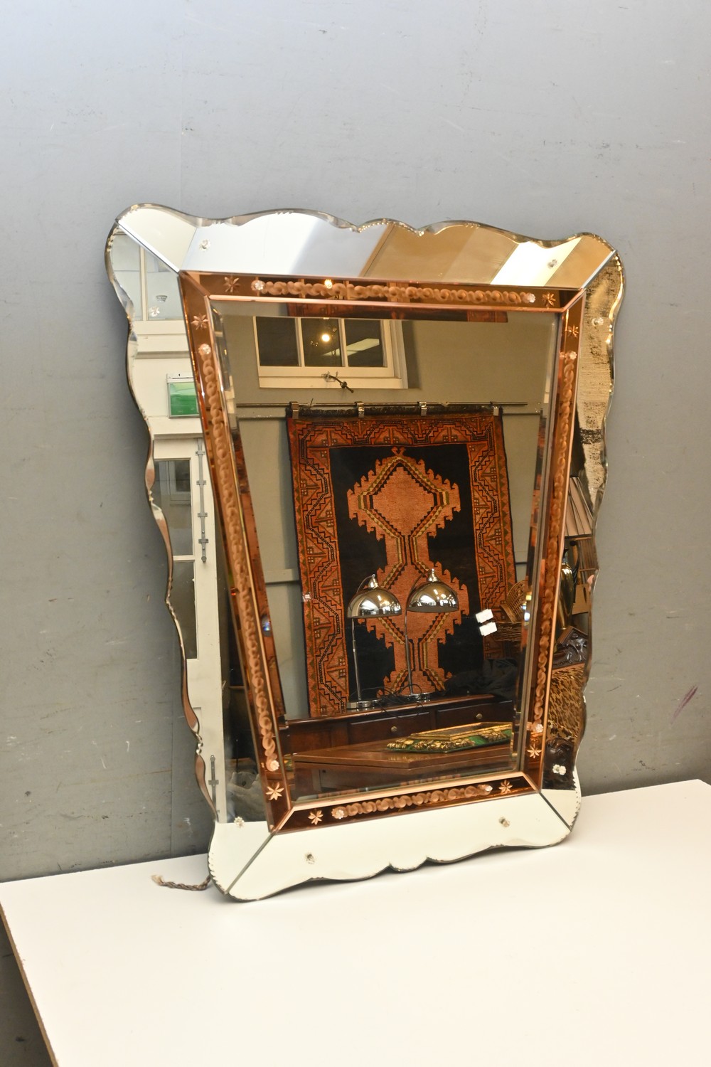 A FRENCH ART DECO PEACH AND CLEAR GLASS FRAMED MIRROR, (94H X 81CM) (LEONARD JOEL DELIVERY SIZE: LARGE)