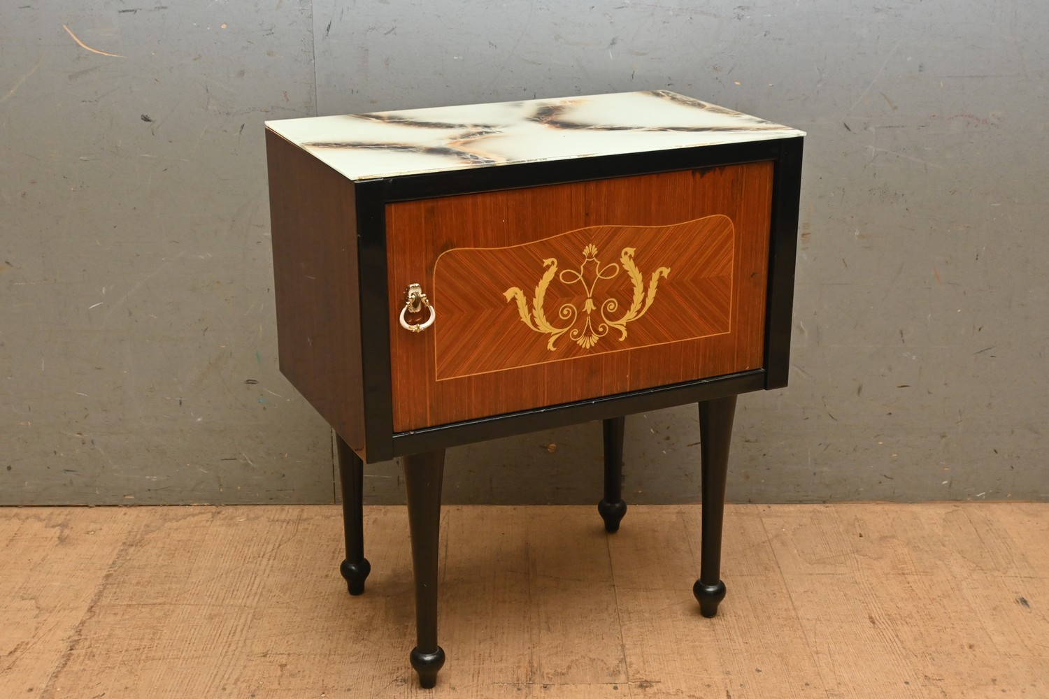 VINTAGE 1960S ITALIAN INLAID SINGLE DOOR ORIGINAL GLASS TOP SIDE CABINET A/F (LEONARD JOEL DELIVERY SIZE: MEDIUM) (59H X 31W X 31D)