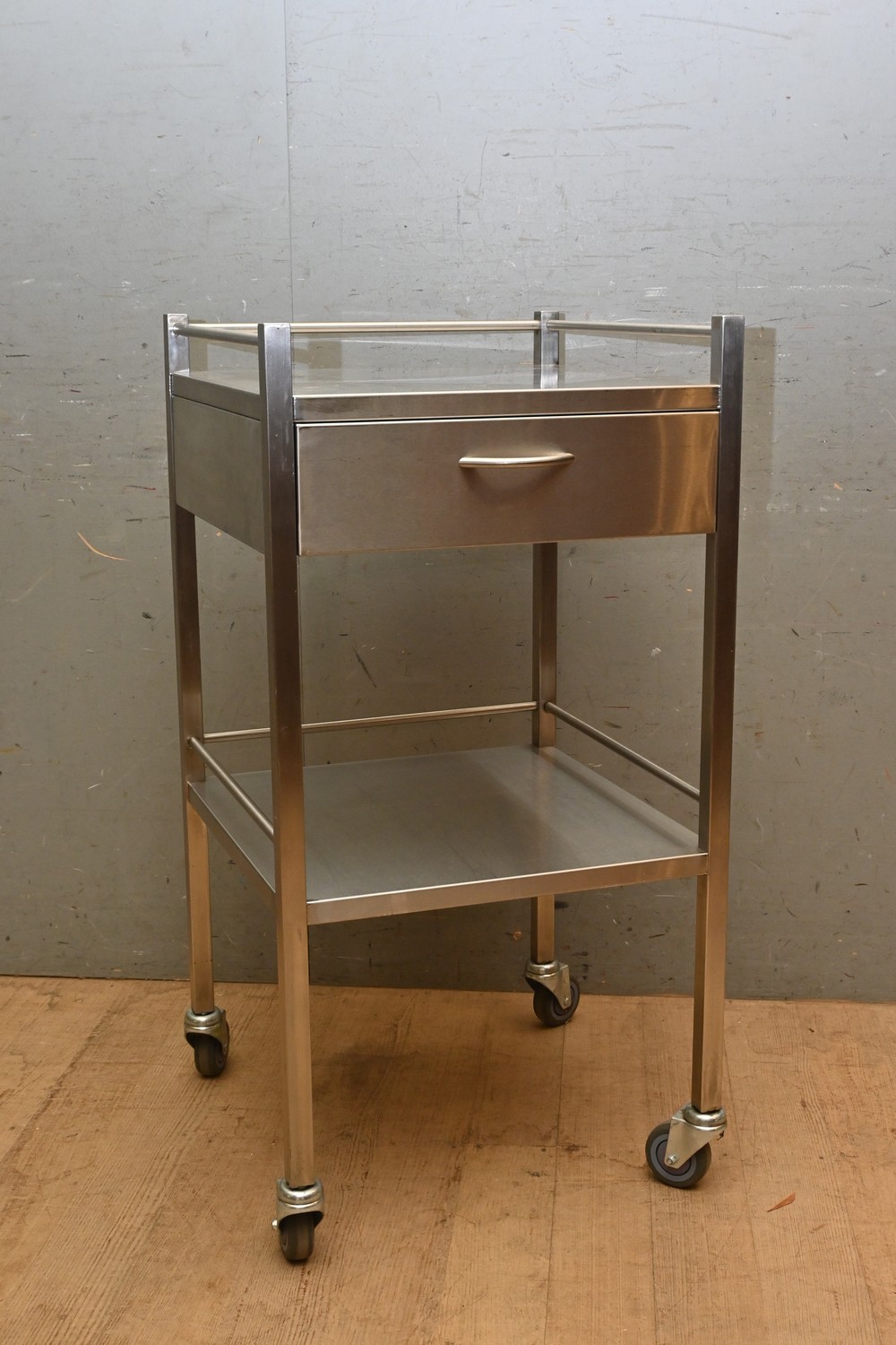 1970S AUSTRALIAN MADE FULL STAINLESS STEEL SINGLE DRAWER AND GALLERY SHELF HOSPITAL TROLLEY ON WHEELS (96H X 48W X 54D CM) (LEONARD JOEL DELIVERY SIZE: LARGE)