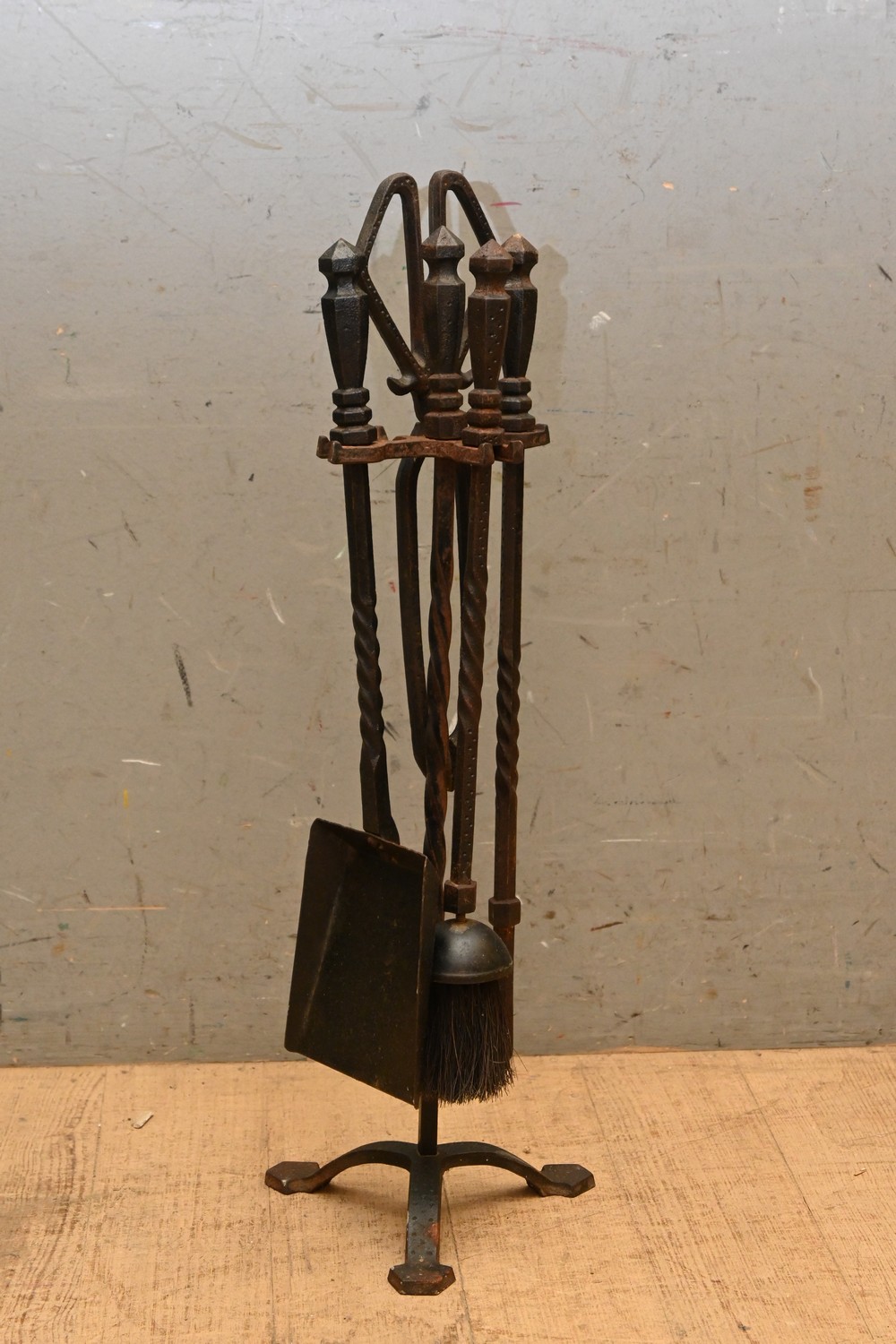 A WROUGHT IRON FOUR PIECE FIRE TOOL SET ( 60H CM) (LEONARD JOEL DELIVERY SIZE: MEDIUM)