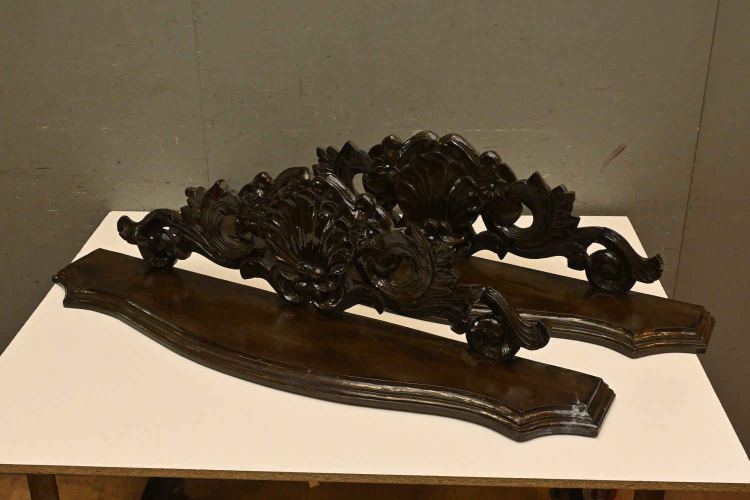 A PAIR OF CARVED MAHOGANY WALL MOUNT SHELVES (A/F) (29H X 110 W X 23D CM) (LEONARD JOEL DELIVERY SIZE: LARGE)