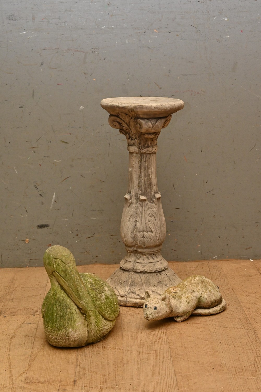 GROUP OF THREE VINTAGE RECONSTITUTED STONE PEDESTAL PELICAN AND CAT FIGURES (A/F) (55CM H X 24CM DIA) (LEONARD JOEL DELIVERY SIZE: LARGE)