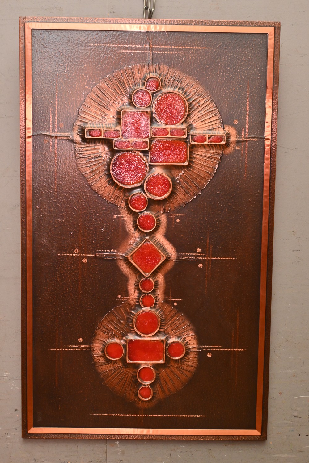 A COPPER AND ENAMEL WALL PLAQUE (A/F) (91 X 55 CM) (LEONARD JOEL DELIVERY SIZE: LARGE)