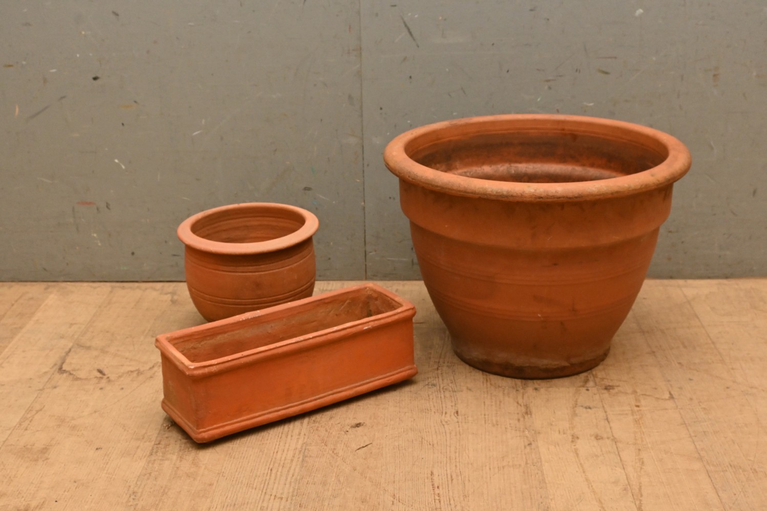 COLLECTION OF THREE TERRACOTTA GARDEN POTS INCL. TROUGH (A/F) (34H X 47W DIA LARGEST) (LEONARD JOEL DELIVERY SIZE: LARGE)