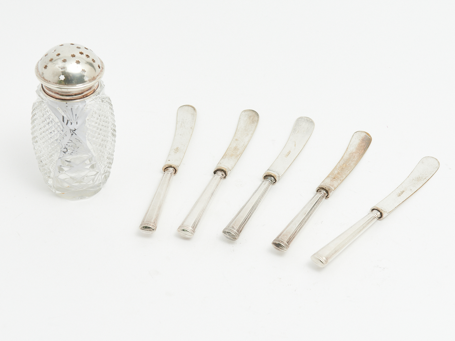 A STERLING SILVER SUGAR CASTOR TOGETHER WITH STERLING SILVER HANDLED PATE KNIVES H.12.5CM (LARGEST), LEONARD JOEL LOCAL DELIVERY: SMALL