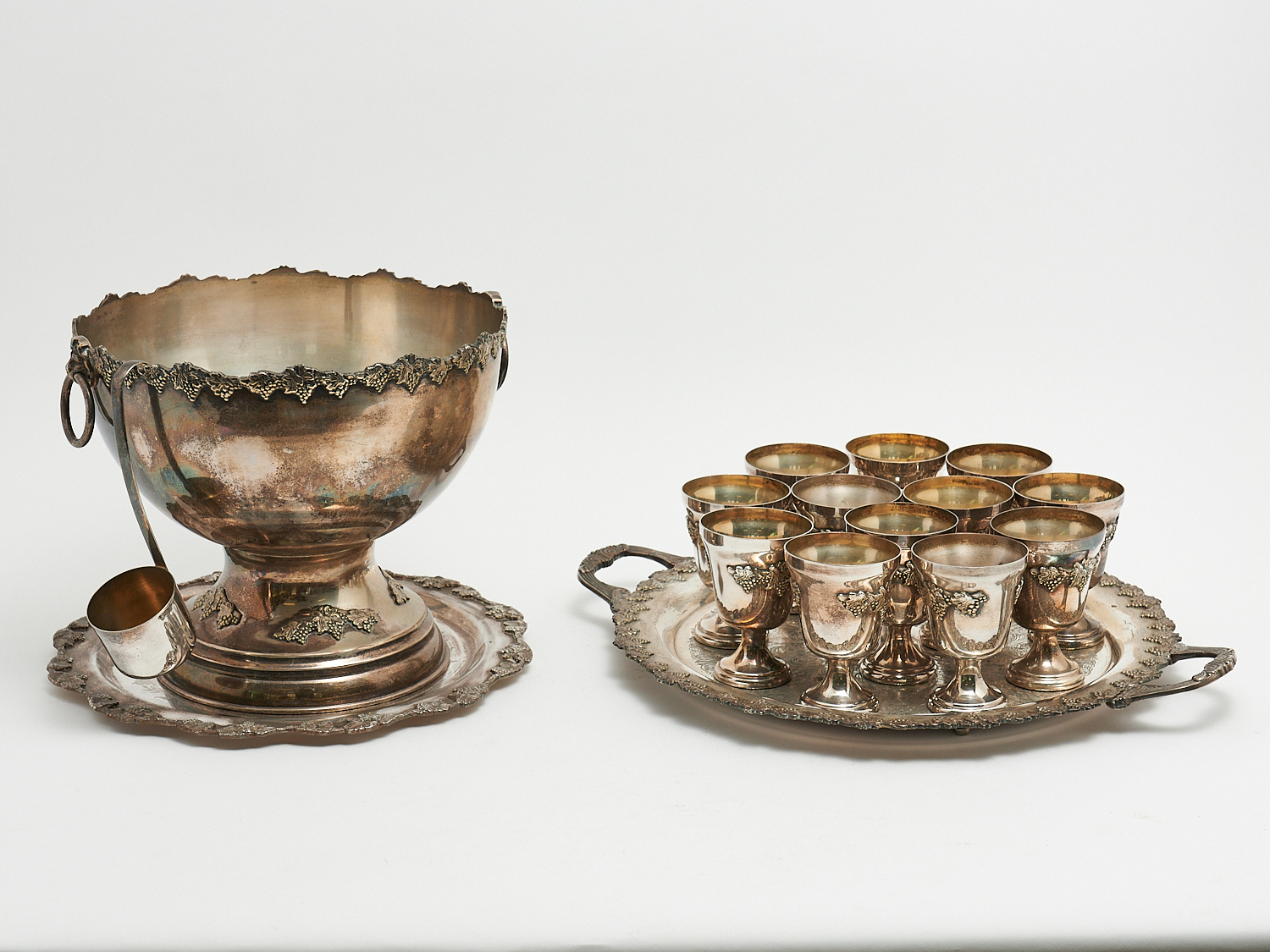 A SILVER PLATED PUNCH SET FOR 12 INCLUDING TWO TRAYS AND A BOWL W.55CM (LARGEST), LEONARD JOEL LOCAL DELIVERY: MEDIUM