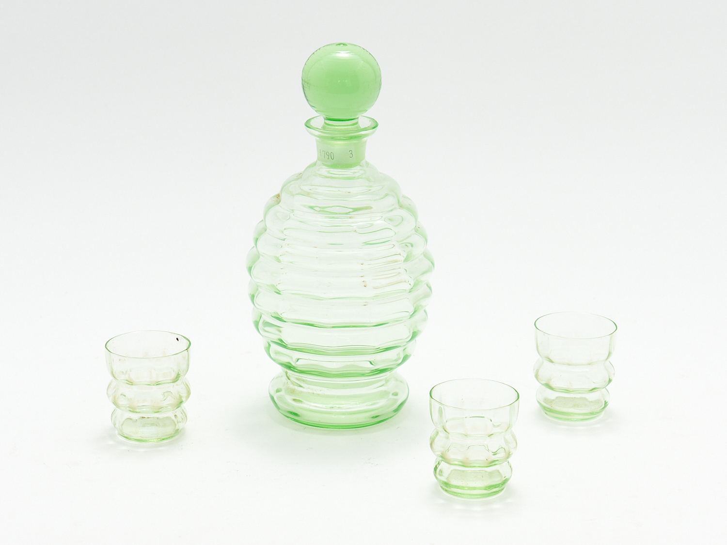 AN URANIUM GLASS DECANTER TOGETHER WITH THREE GLASSES H.22CM (TALLEST), LEONARD JOEL LOCAL DELIVERY: SMALL