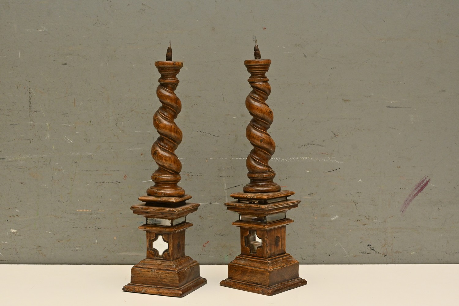 A PAIR OF OAK CANDLESTICKS (40H CM) (LEONARD JOEL DELIVERY SIZE: SMALL)