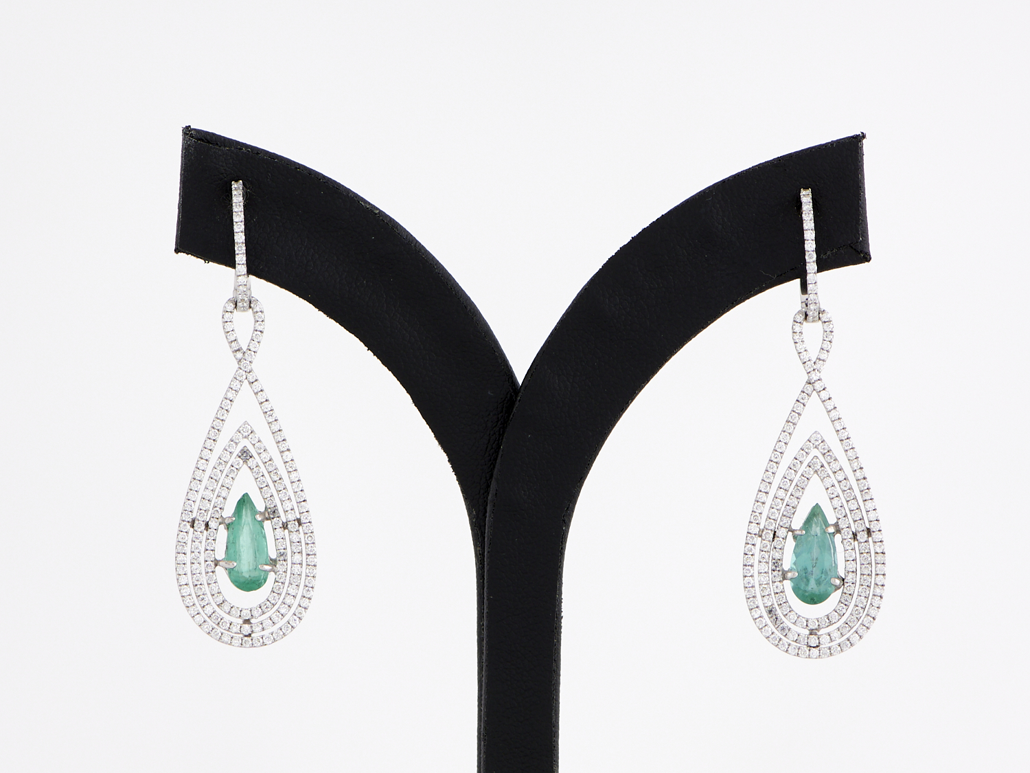 A PAIR OF EMERALD AND DIAMOND EARRINGS IN 18CT WHITE GOLD, TO POST AND LEVER BACK FITTINGS, THE EMERALDS TOTALLING 2.00CTS, THE DIAMONDS TOTALLING 2.70CTS, LENGTH 50MM