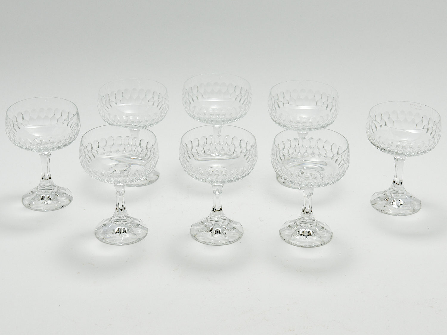 A GROUP OF EIGHT CRYSTAL CHAMPAGNE COUPES (A/F) H.13CM, LEONARD JOEL LOCAL DELIVERY: MEDIUM