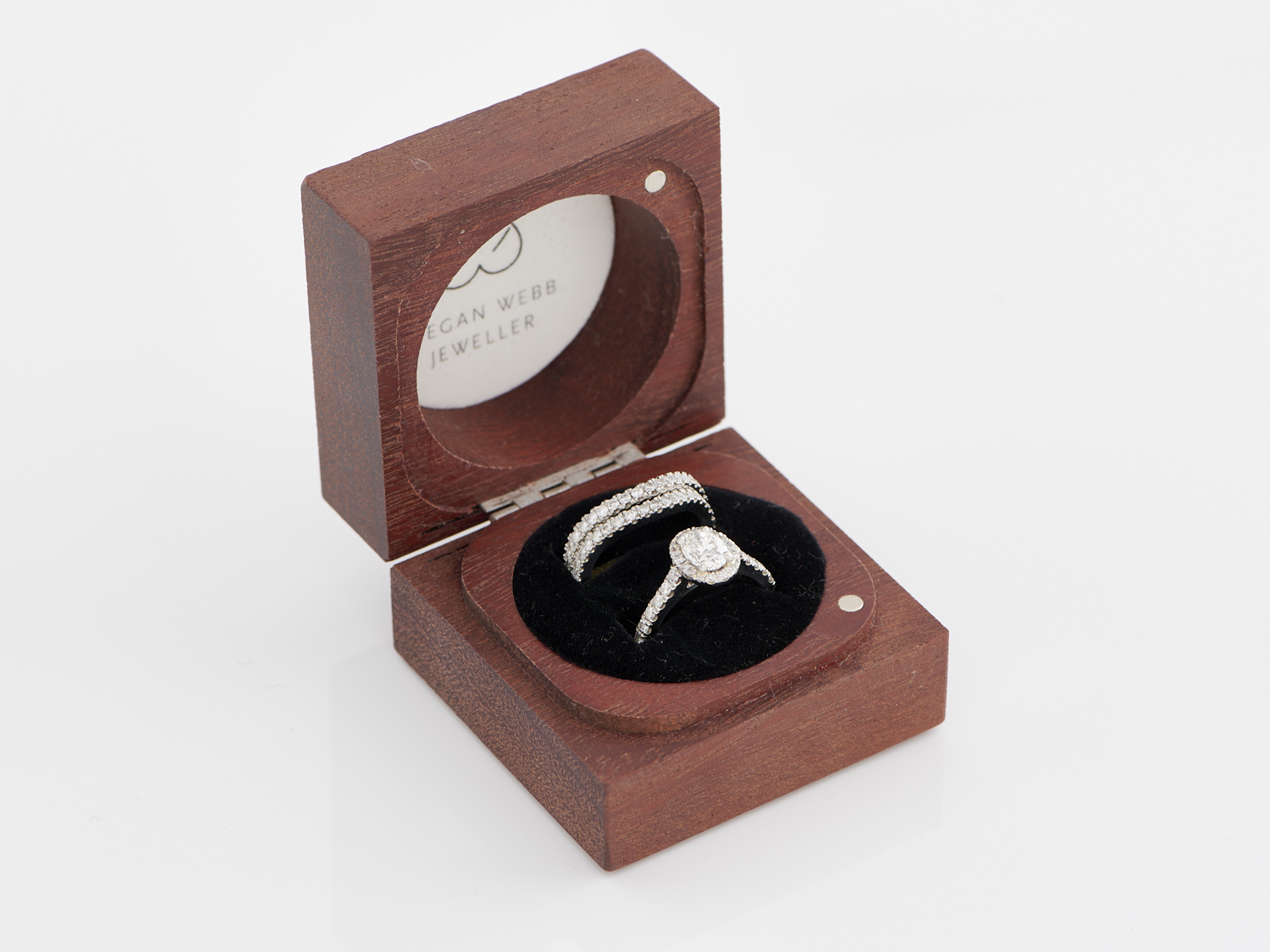 A DIAMOND RING SUITE IN PLATINUM BY MEGAN WEBB, THE CENTRAL OVAL BRILLIANT CUT DIAMOND WEIGHING APPROXIMATELY 0.82CTS (H, SI2), WITH A SURROUND OF 32 ROUND BRILLIANT CUT ARGYLE DIAMONDS TOTALLING APPROXIMATELY 0.46CTS (G-H, VS), ACCOMPANIED BY TWO ARGYLE DIAMOND SET BANDS, ACCOMPANIED BY VALUATIONS, BOXED, RING SIZE J, WEIGHT 14.2GMS