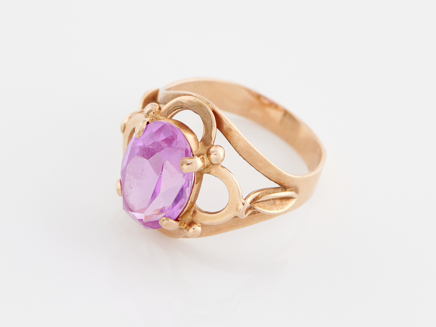 A SYNTHETIC CORUNDUM RING IN 14CT GOLD, RING SIZE U, 6.4GMS