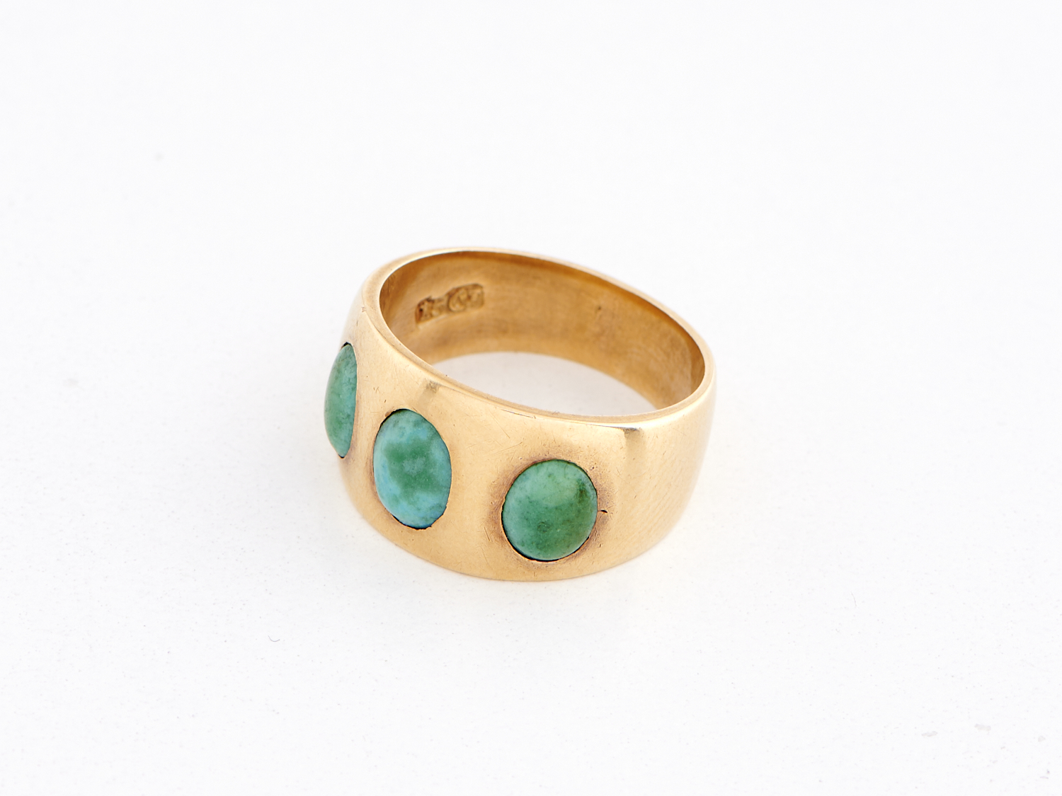 AN ANTIQUE TURQUOISE RING IN 15CT GOLD, RING SIZE K, WEIGHT 7.5GMS