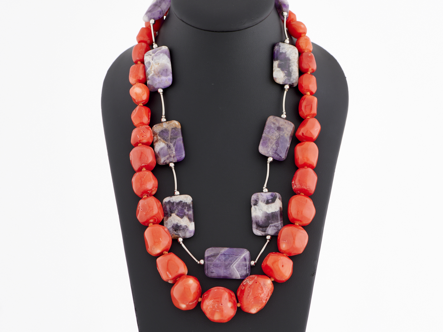 A TUMBLED GRADUATED CORAL BEADED NECKLACE, ALONG WITH AN AMETHYST NECKLACE WITH FITTINGS IN SILVER