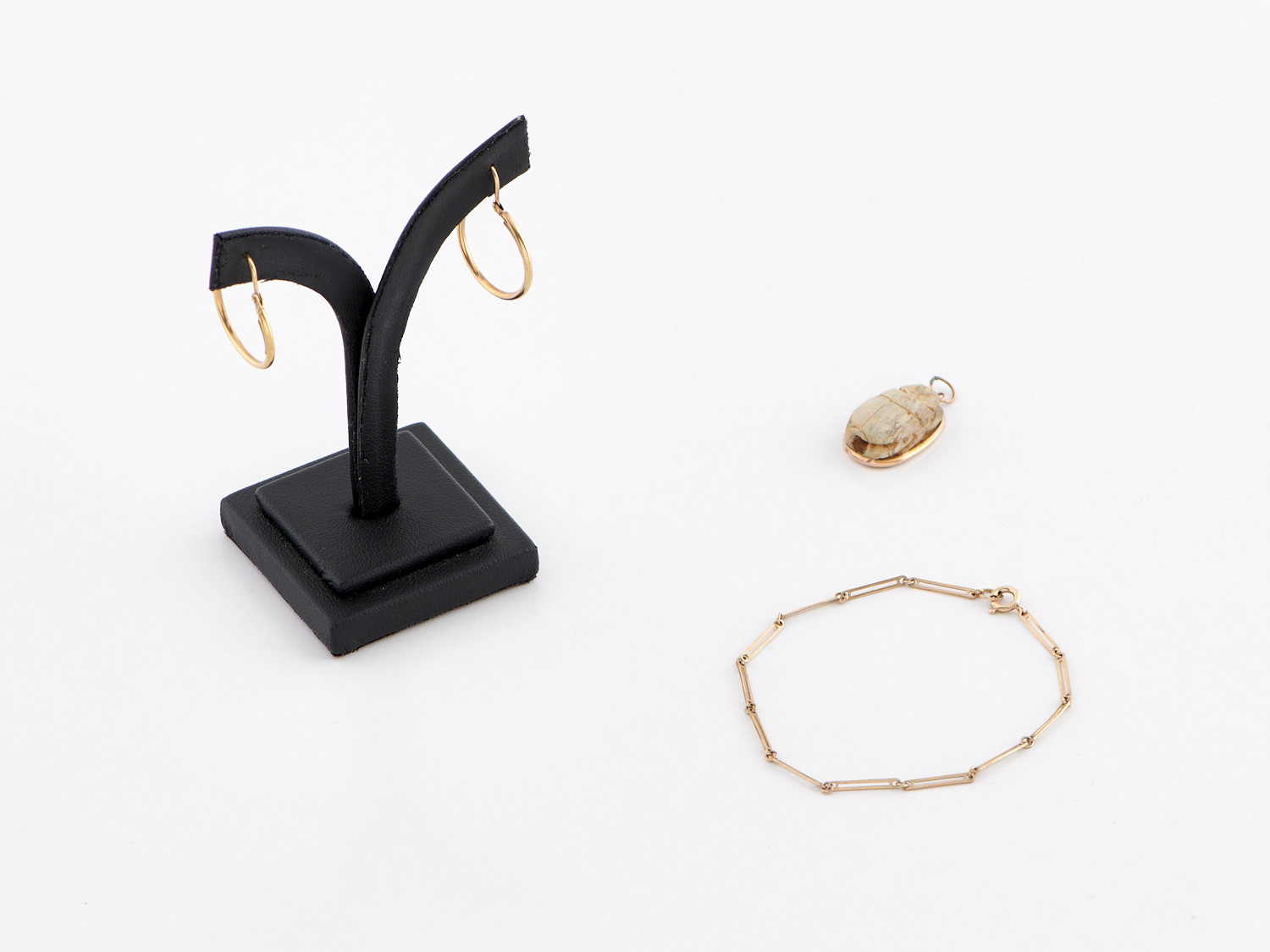 A SCARAB PENDANT, TOGETHER WITH A PAIR OF GOLD HOOP EARRINGS AND A FANCY LINK GOLD BRACELET, ALL IN 9CT GOLD, WEIGHT 5.4GMS