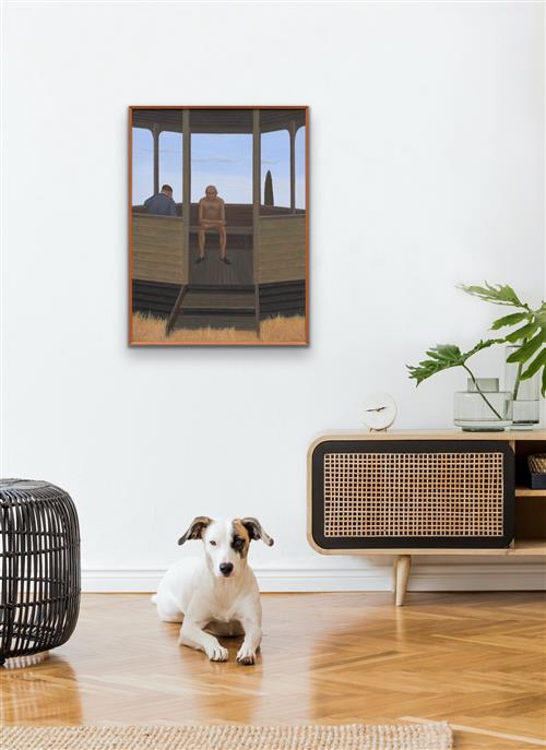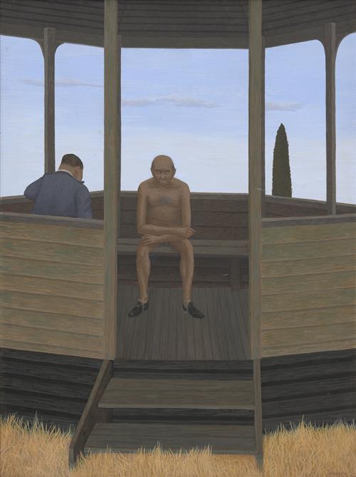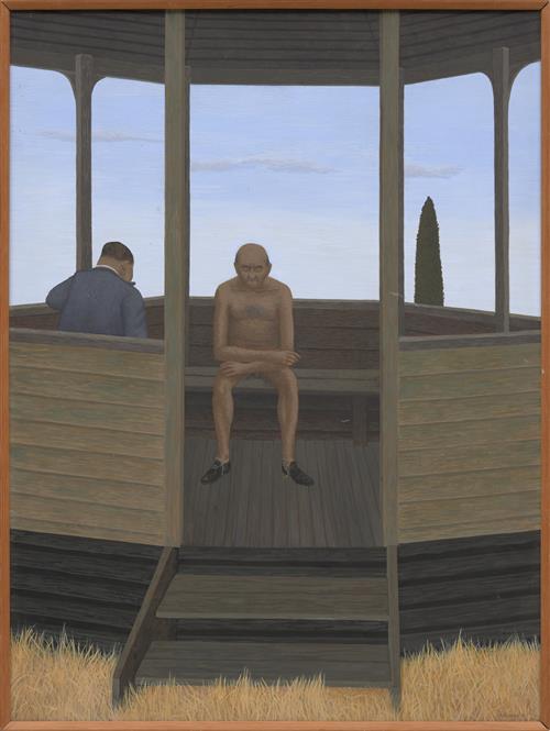 In 1971 Rick Amor visited the Sunbury Mental Hospital as a survey assistant. Two patients sitting under a gazebo caught his attention and inspired this painting.