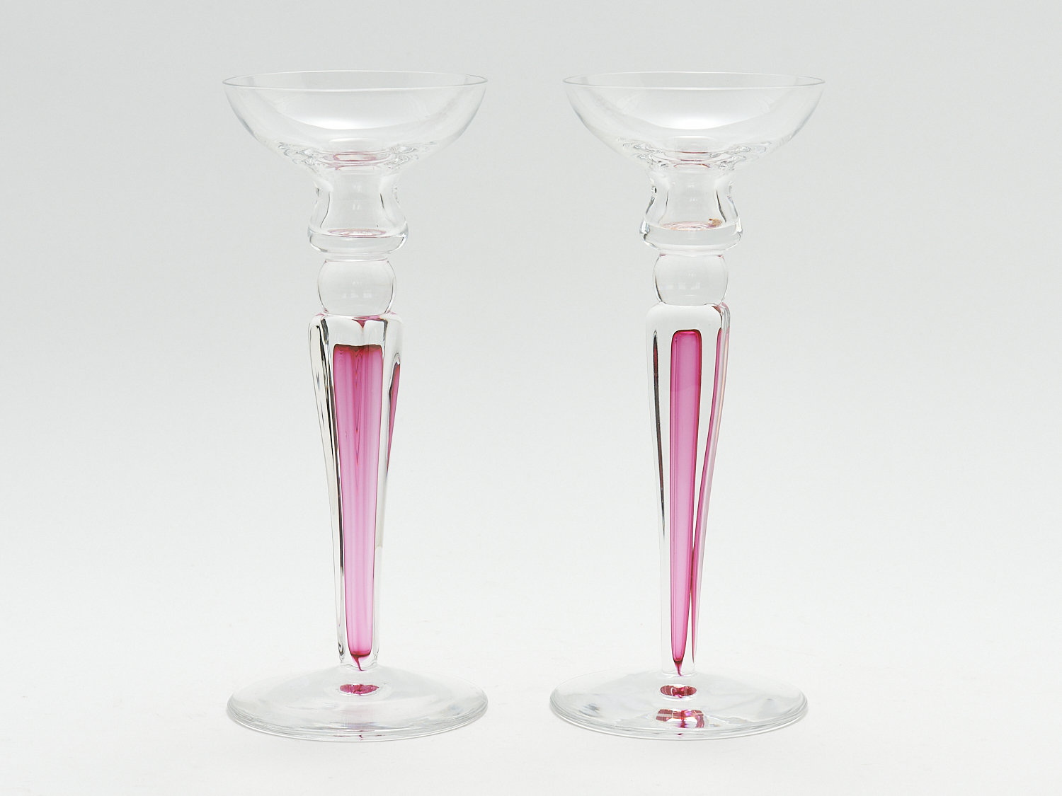 A PAIR OF VAL ST LAMBERT PINK AND CLEAR GLASS CANDLESTICKS, H.25.5CM, LEONARD JOEL LOCAL DELIVERY: MEDIUM