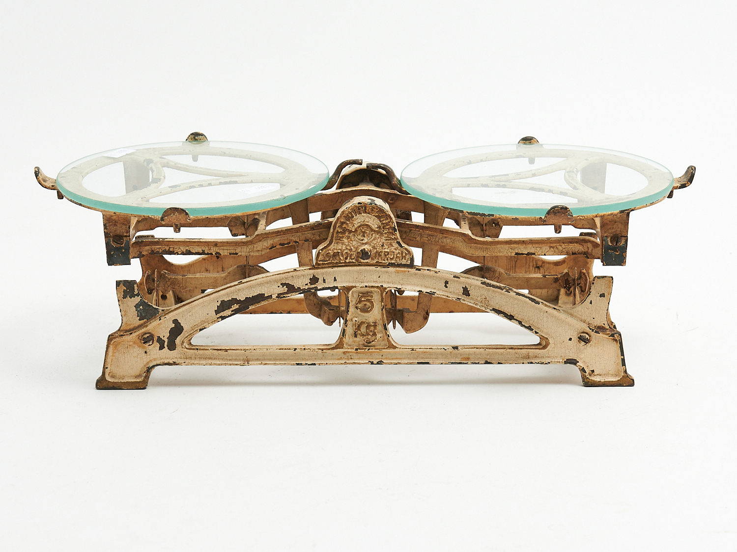 A SET OF PAINTED CAST-IRON AND GLASS BALANCE SCALES, W.40CM, LEONARD JOEL LOCAL DELIVERY: MEDIUM